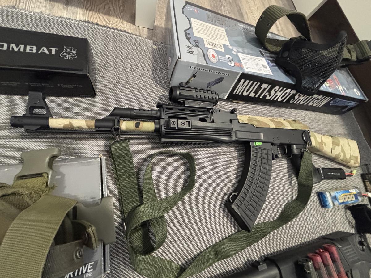 szett tartalma: AK akkumlátoros gépfegyver, tár, red dot,cybergun pt92 fegyver, tár,lézer,M56b shotgun,töltények,oldal lőszer tartó,