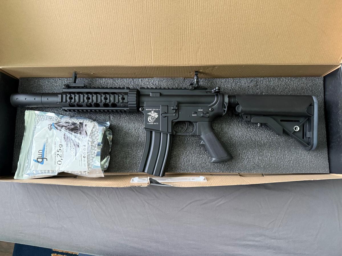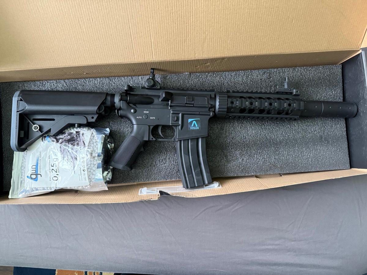 1 db Airsoft rifle M4 RIS CQB with silencer - black (EC-607) [E&C] : link: https://airsoftpro.hu/hu/airsoft-fegyverek/elektromos-hosszu-aeg/m4-m16-sr25-416/airsoftova-zbran-m4-ris-cqb-s-tlumicem-cerna-ec-607-detail?srsltid=AfmBOorgfHDP3O7lEEFhsTR6tmJljSCz12gswiRtqsEoKTCJCB_Gf0RV