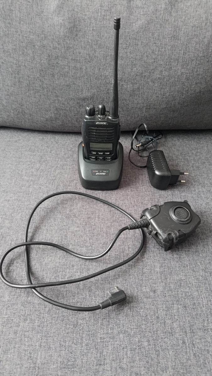 Eladó a képen látható Puxing 777 UHF rádió, dokkolóval, kábellel és PTT-vel headsethez.