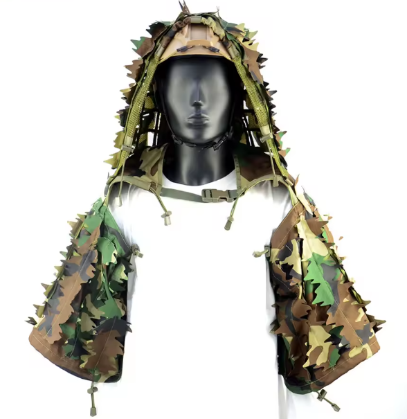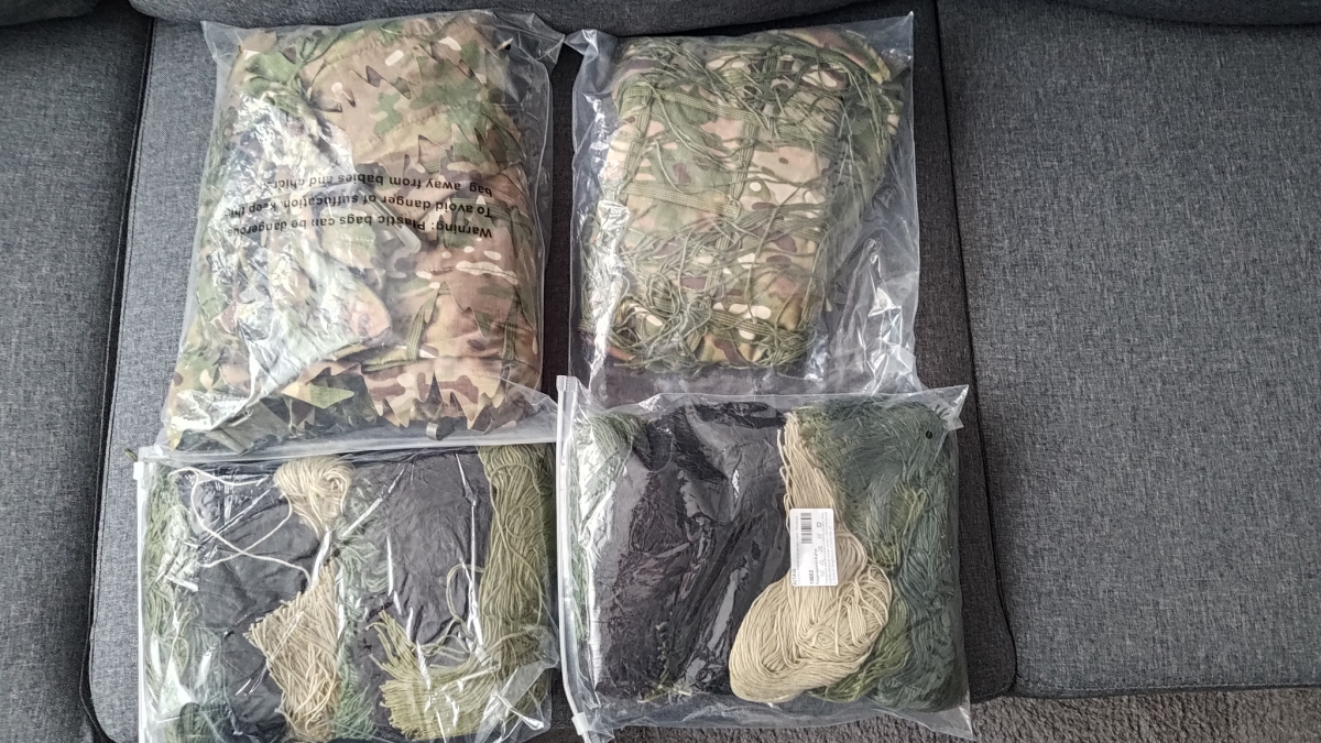Eladó a képen látható ghilie poncho és köpeny (multicam, mű levelekkel) + 2 zsák színezett fonál.