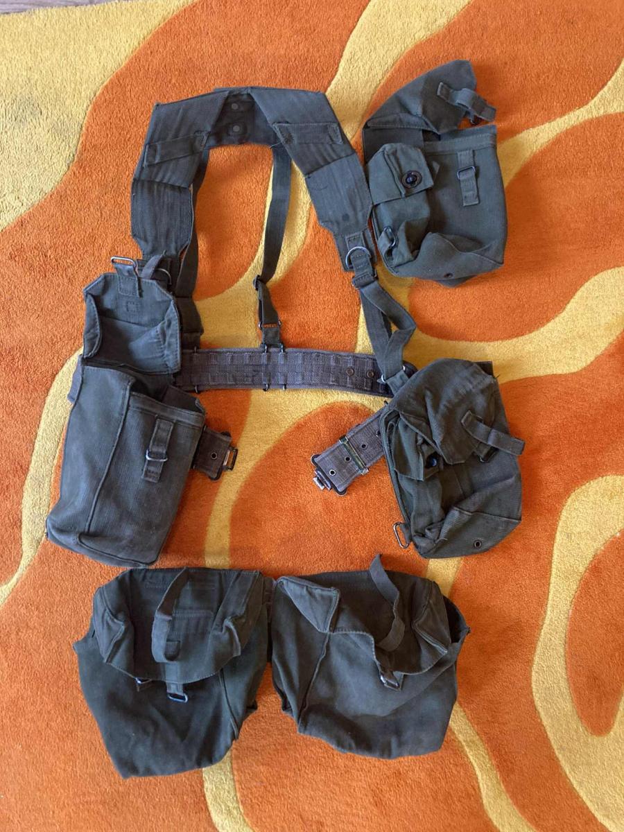 Eladóvá vált brit '58 Pattern Webbing szettem. Retro, mindent is túlélő anyagokból. 3db tárzseb és dupla "kenyér zsák" van.