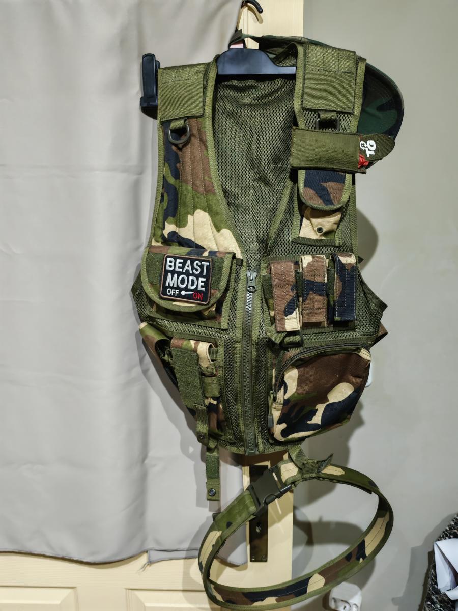 A képen látható hordtáska és mellény szintén eladóak.