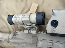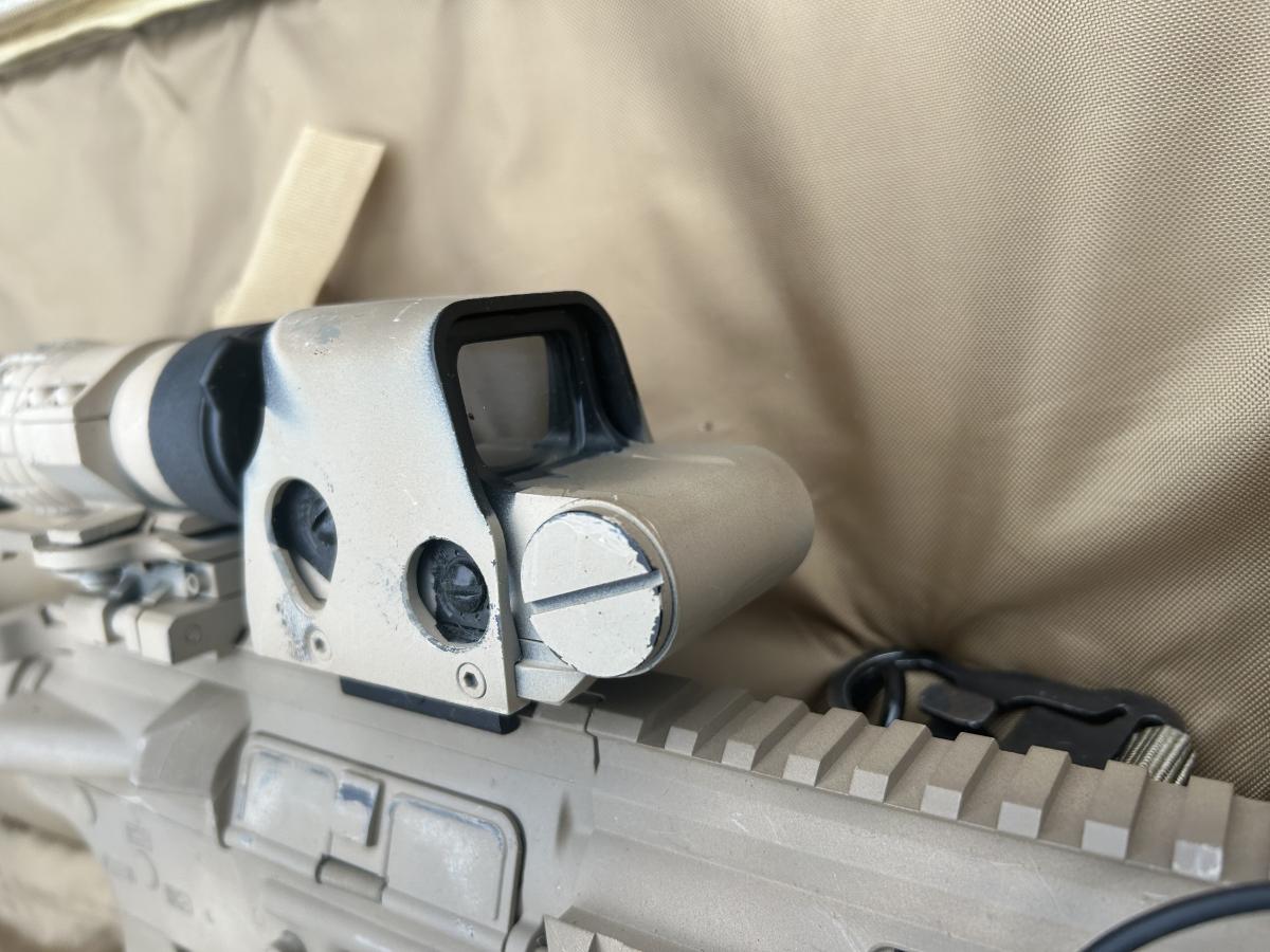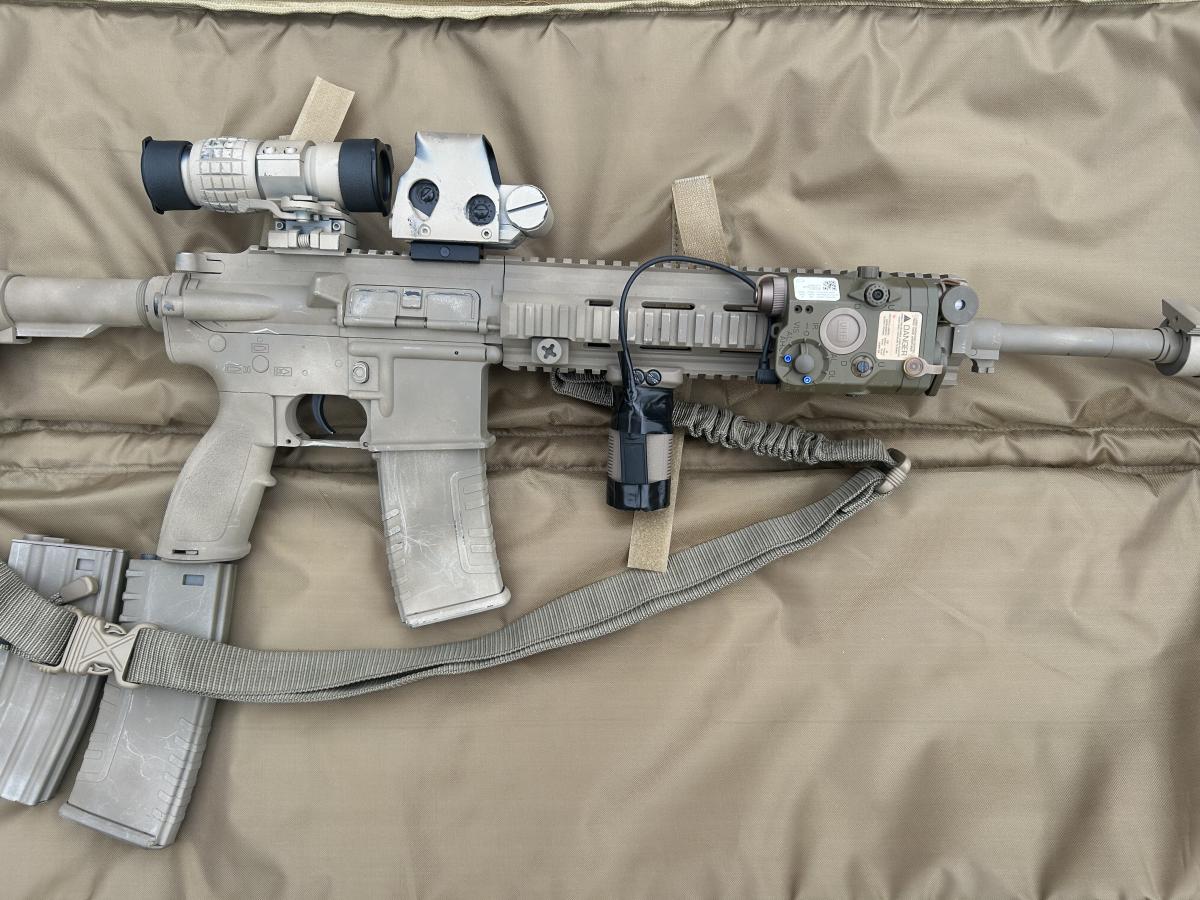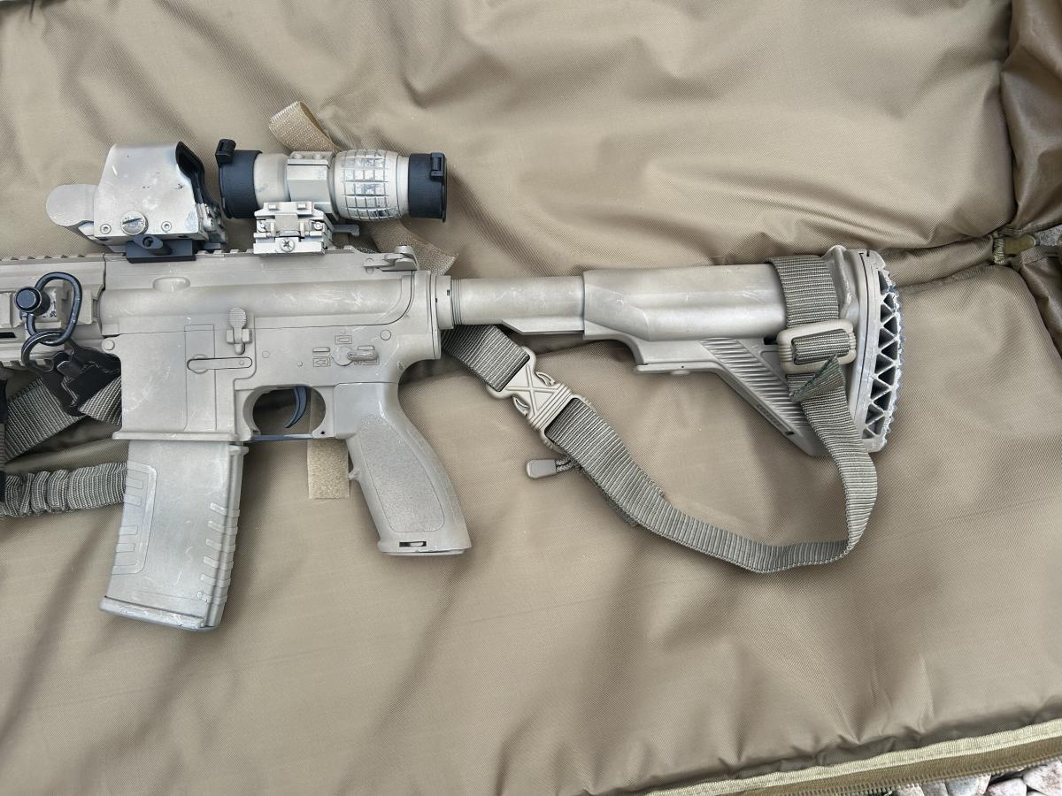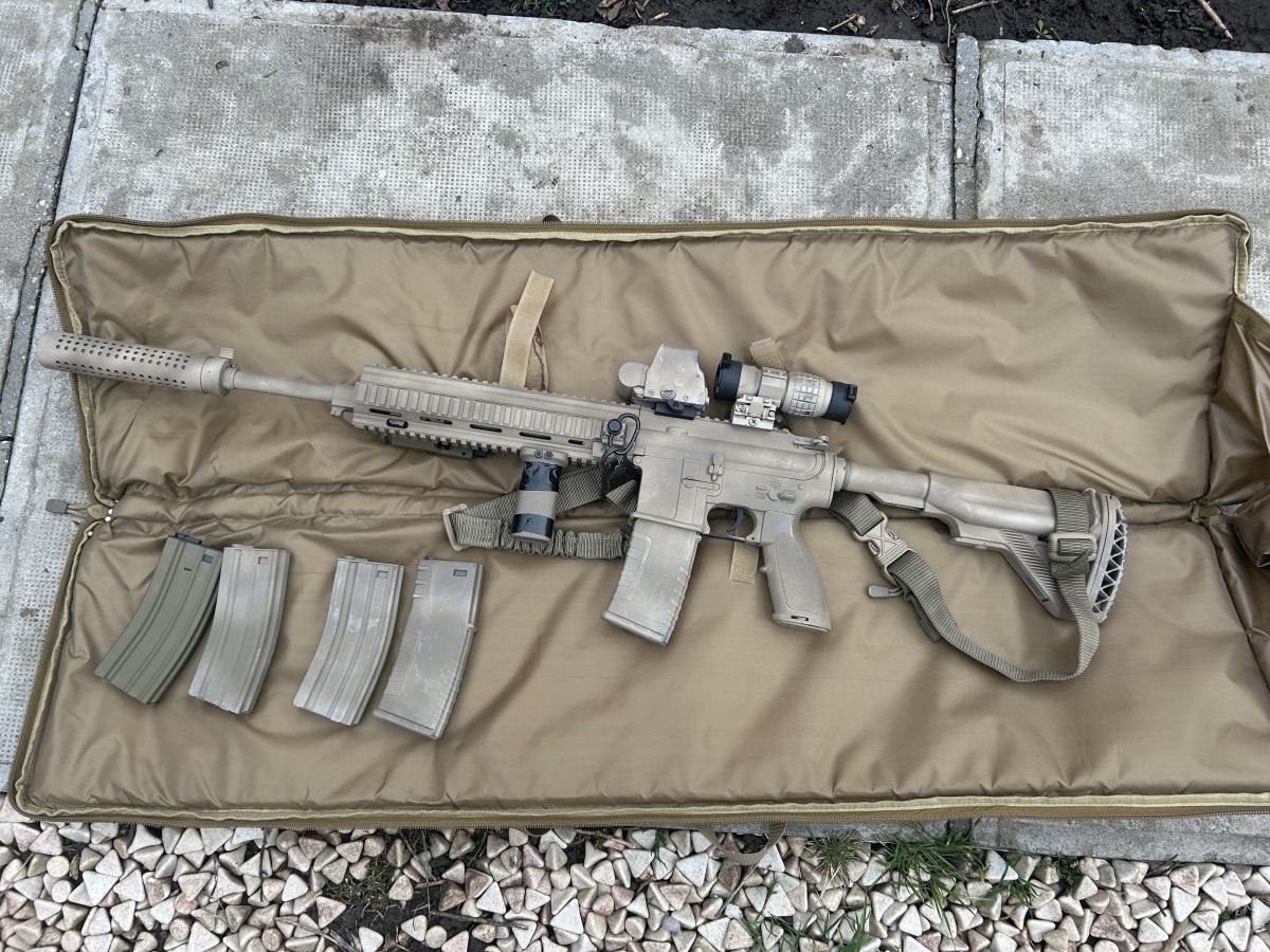 Eladó teljesen fém AEG egyedi festéssel a képeken látható kiegészítőkkel ! Csak használni kel ! Guerilla Red Dot és 3x35 távcső , PEQ15 , hangtompító , USMC fegyverszíj , tartalék tárak, fehyvertáska