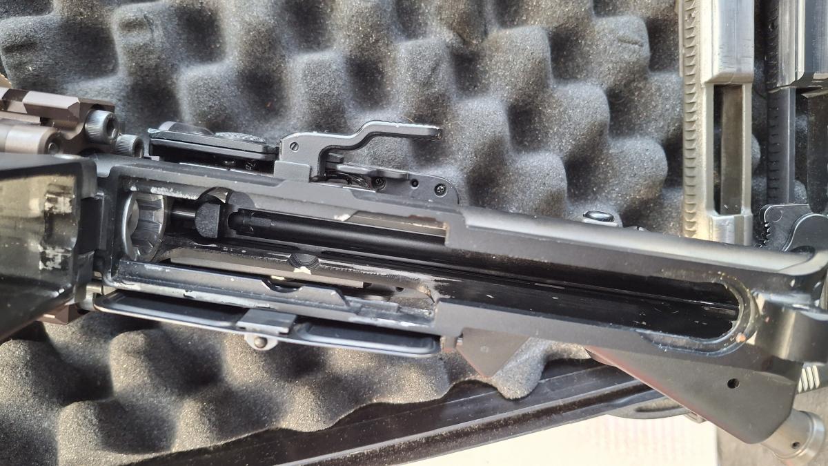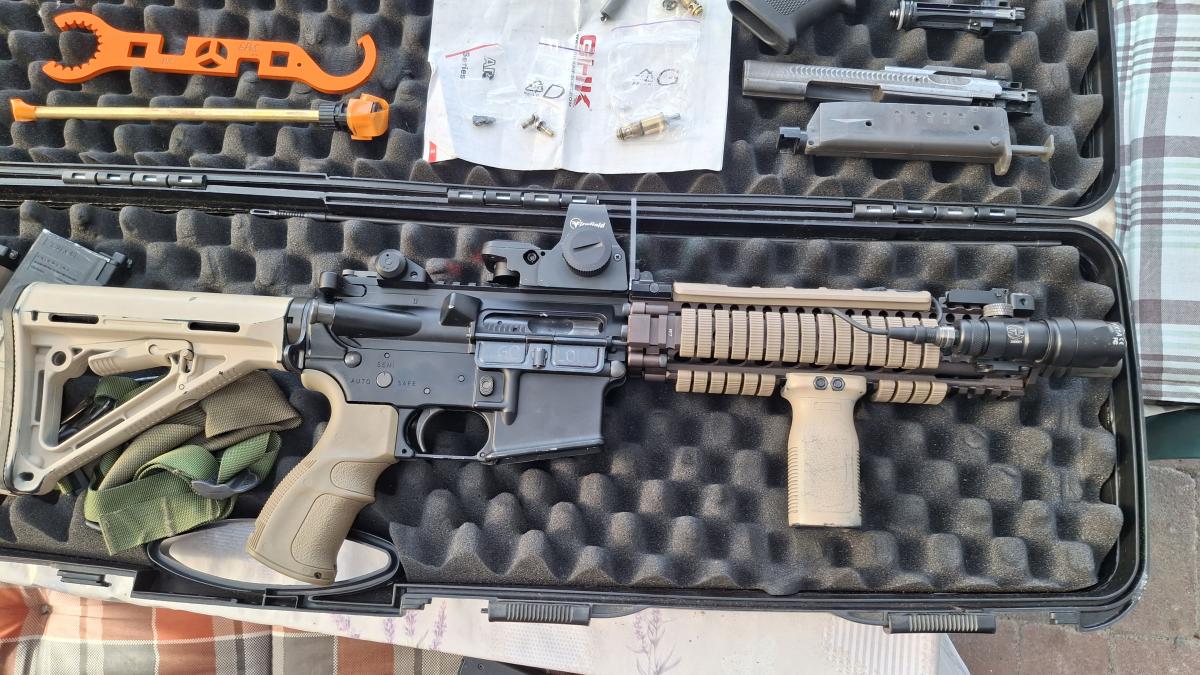 Kapott egy Ra-Tech 250mm-es 6.02-es GBB prec csövet és az új Gen2-es HopUp kamrát, ezen kívül mást csak kívül módosítottam. Kapott egy új pisztolymarkolatot, amiben a Gen2-es hopup állítója elfér, így mindig kéznél van, ha szükséges. A első markolatot és a tust, valamint a fekete tárakat TAN színre fújtam (MFH Desert MATT). A FireField, alsókategóriás éles fegyverre való reflex Holo a replikán tökéletesen működik, előtte egy belövés elleni plexi kapott helyet. Gyárilag menetes csöve van, minden 14CCW tracer felszerelhető rá könnyedén. 1 db tár problémás, valami adagolási problémája van és jelenleg ereszt is. Eleve donorként vettem, végül nem javítottam meg, de ha Neked sikerül akkor összesen 6 tárad lesz!