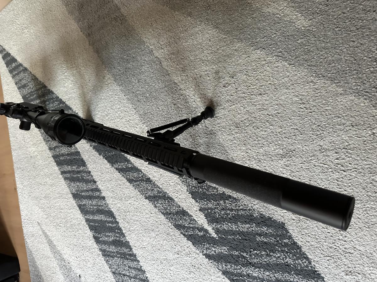 Maga a márka magáért beszél, ennek már M-lock előagya van, nagyon kecses, jó fogású darab. Természetesen licenszelt, teljesen fém, a betolható válltámaszban én egy 6000 mAh-s li-ion akkumulátort használtam, tehát van benne hely elég. A távcső 6-24-es, zöld, piros szálkereszt megvilágítással. Overkill rá de szeretem látni az áldozat arcát :D.
