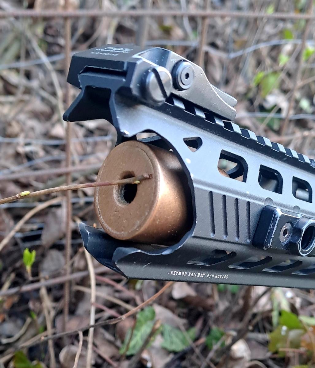KeyMod / KeyLok rendszerű előagy sín, amire könnyen lehet kiegészítőket (lámpa, markolat stb.) rögzíteni.