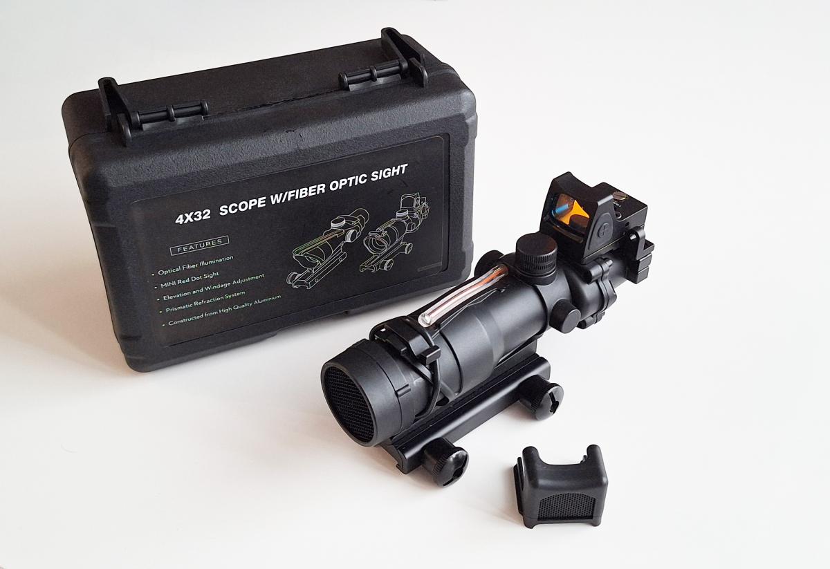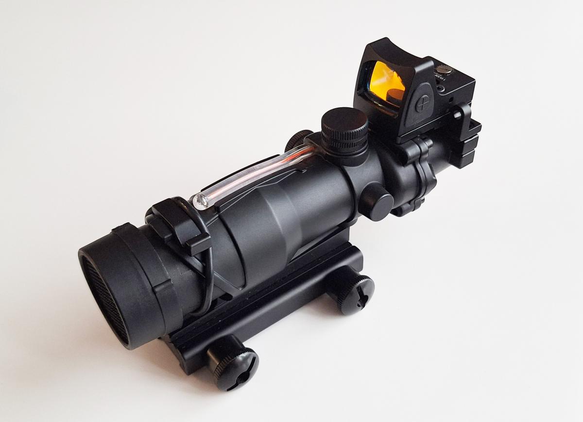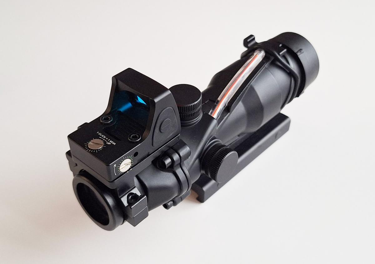 Sosem használt fénygyűjtős Trijicon ACOG replika 4x nagyítással, tetején nyílt irányzékkal, és egy RMR mini red dottal. Tökéletesen működik. Nincs szükség elemre, a fénygyűjtős szál világítja meg a szálkeresztet (fiber optic).
