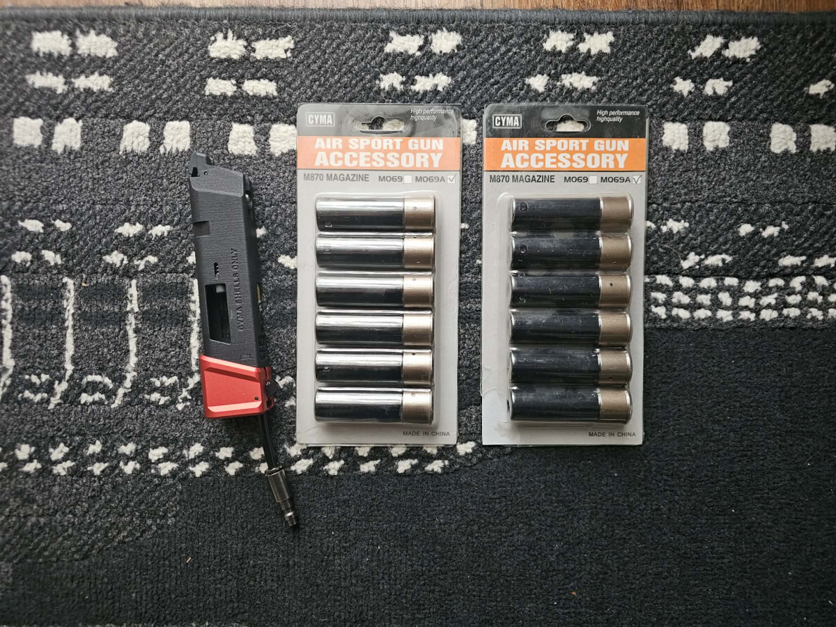 Az adapterhez adok 2 csomag (12 darab CYMA shotgun shellt), amikről a matricákat leszedtem, mivel azzal kicsit szorult az adapterben.