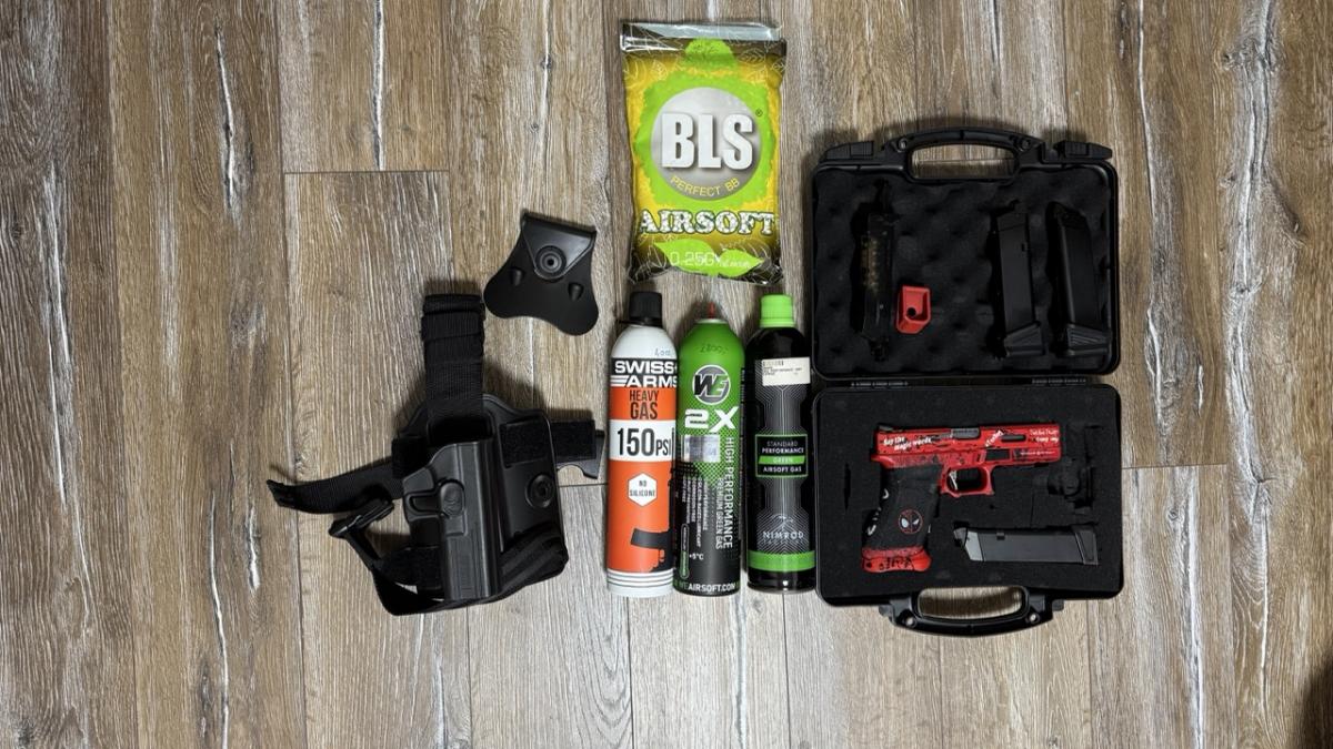 Eladó Ascend/WE Deadpool glock + tárakkal, 3 palack gázzal (csak a Nimrod fogyott, a másik kettő teli van), 1 csomag BB, comb/öv gyorstok, gyorstöltő, + táska.