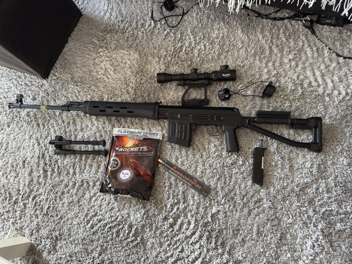 Eladó egy pár éve vásárolt A&K svd-s dragunov rugós airsoft puska tuning rugóval (170m/s), boshile céltávcsővel és bipoddal.