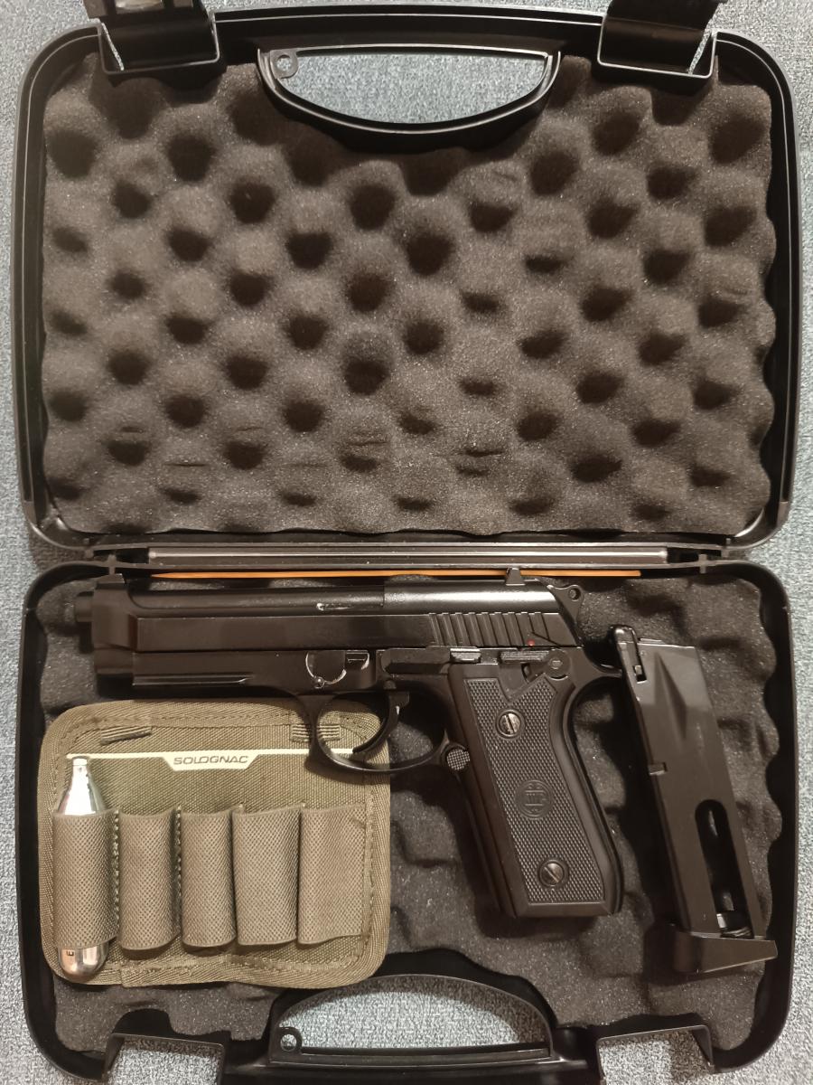 Sokáig pihent saját kofferjában, mert a tárban a szelep elengedte a gázt. Kapott egy gyári új tárat. Most keresi új gazdáját. Amit tudni kell róla: full fém, full autó. Használható egyes és sorozat lövéssel. Használtan vettem ezen az oldalon. A pisztoly hibátlan, az új tárhoz egy CO2 patront használtam el tesztelésre. Ha kell adom hozzá a régi tárat, ami enged. Blow-back rendszer, teljesen fém. Kb. 1,2kg.
