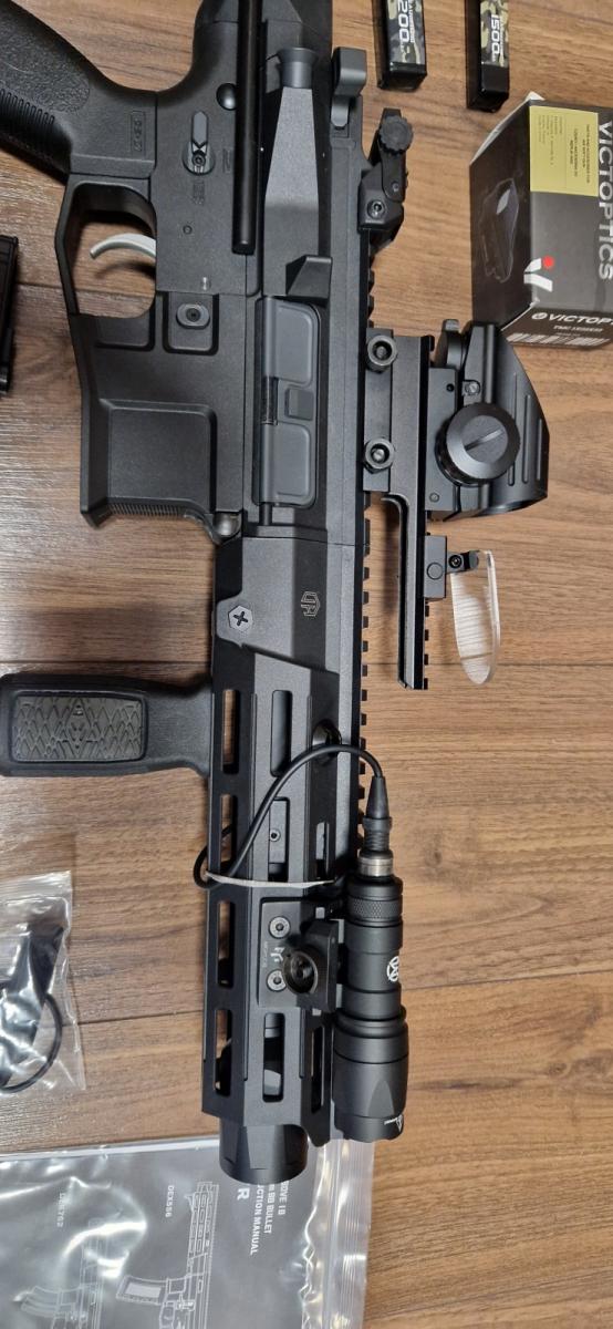 A puskában cseréltem belső csövet Guarder 6,02 mm -re, Modify Hopup gumit és Flat lenyomót kapott. A puskához tartozik a magasítóra helyezett Victoptics Red Dot, egy Flash light illetve egy kiegészítő grip.