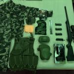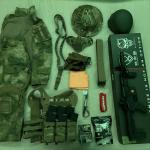 valamilyen multicam-szerű nagyon egyszerű könnyű szellős nadrág+zubbony amit ghilie alapnak szántam (185/85 felnőttre jó). Egy elől zipzáras OD mellény + pisztoly zsebbel, térd és könyök védő, balaclava, mesh maszk, találat jelző
