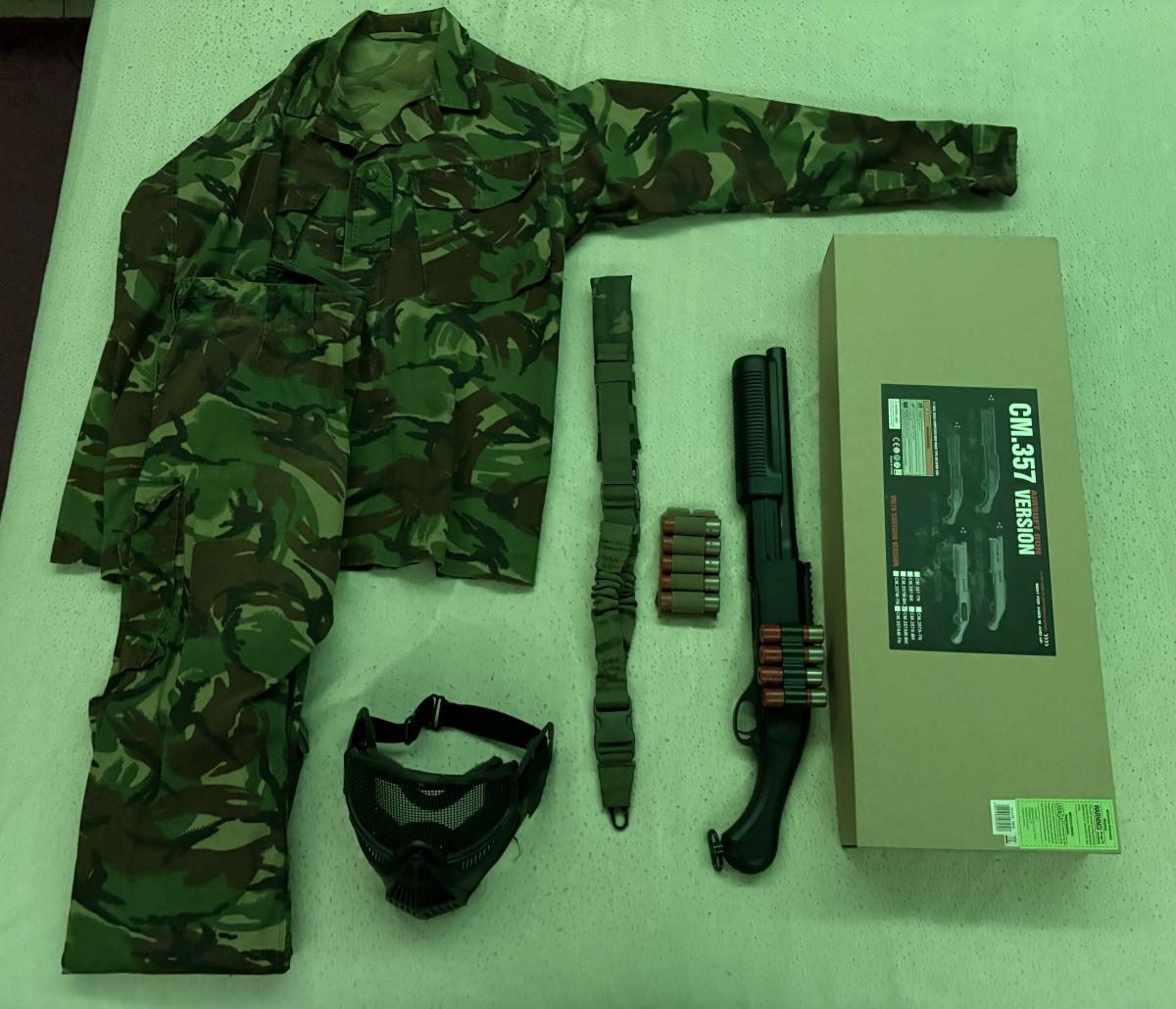 CYMA CM.357 rugós három lövetű shotgun 9db shell tartóval, fegyverszíjjal. Terep mintás zubbony+nadrág és egy fekete mesh/arc maszk.