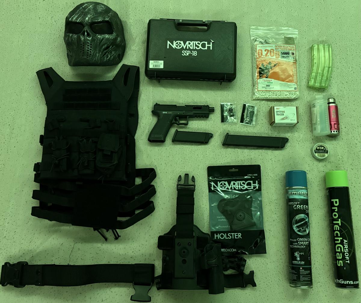 Hosszú tárral, tartalék tár alkatrésszel, spitfire tracerrel és hozzátartozó BB-vel. Novritsch combtokkal, övvel és egy fekete tactical vest amibe elfér a kedvenc Tectonic Quake 7 - hét ! - lövetű gránát ami 6mm-es start patronnal iszonyat hangulatot tud adni szobáról szobára lehet vele haladni és csak dobálni kell!