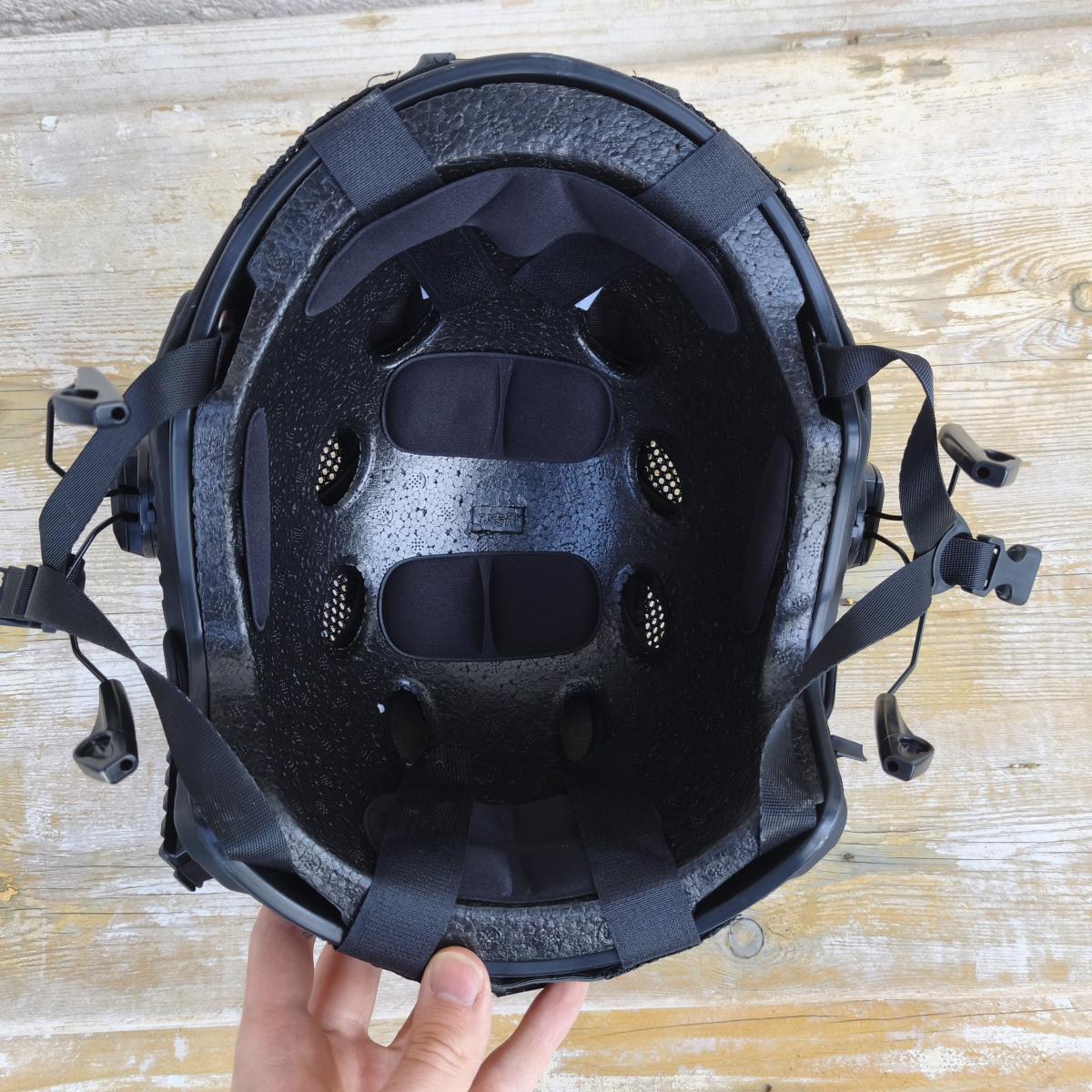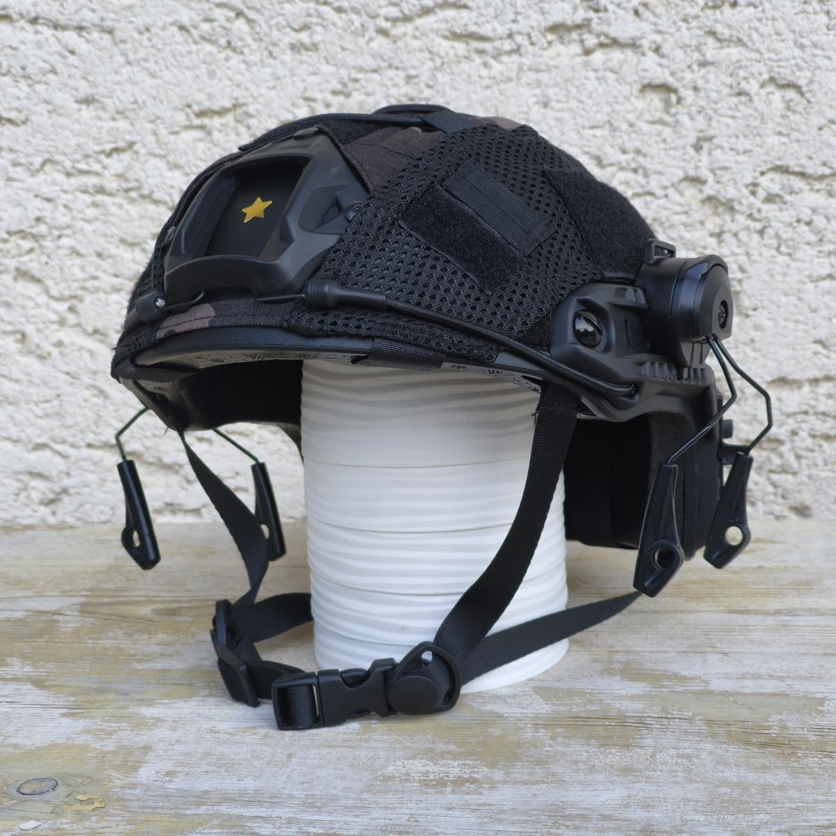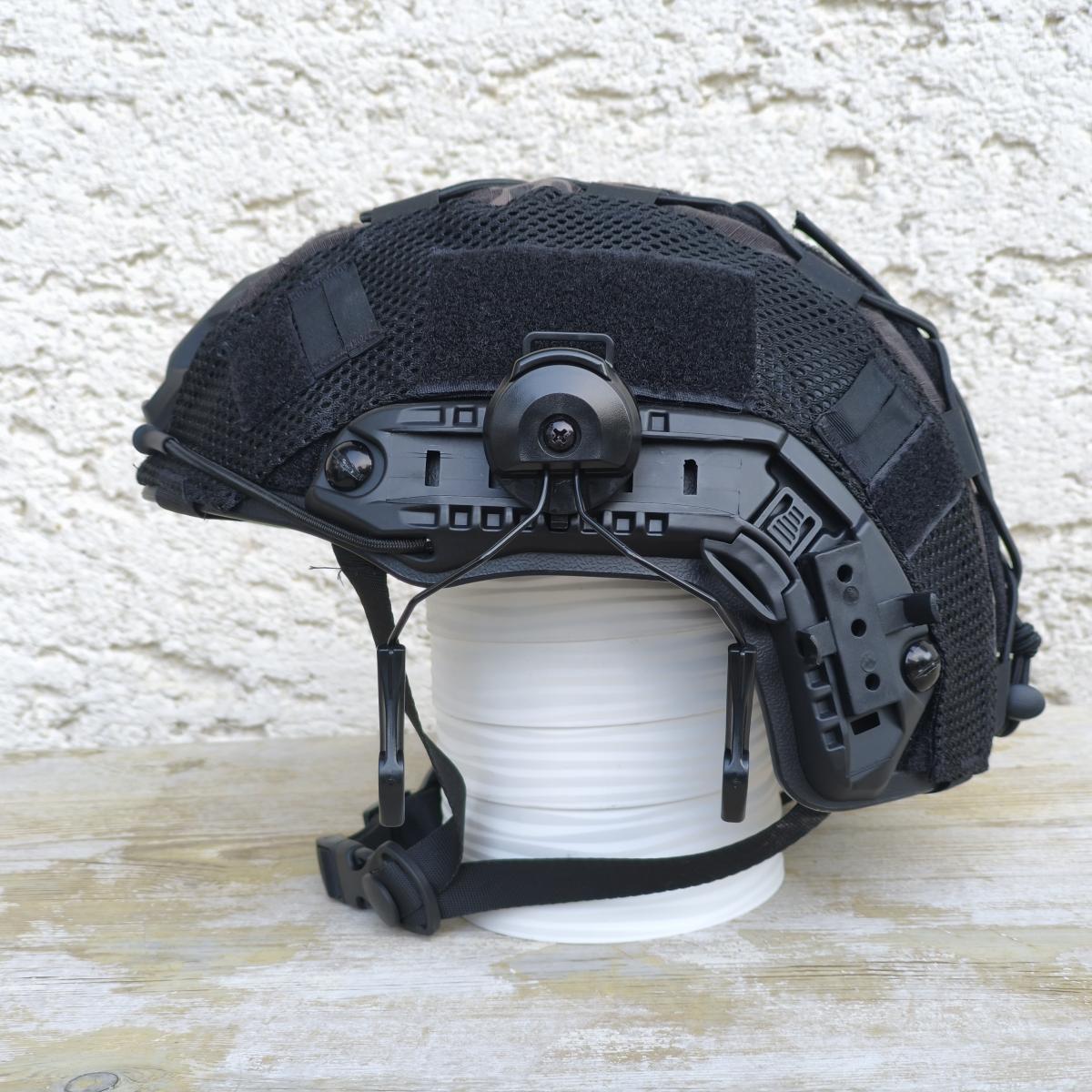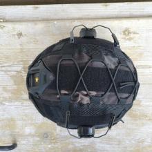 Kihasználatlanság miatt eladó fekete PJ sisak multicam black huzattal, füles-tartókkal.