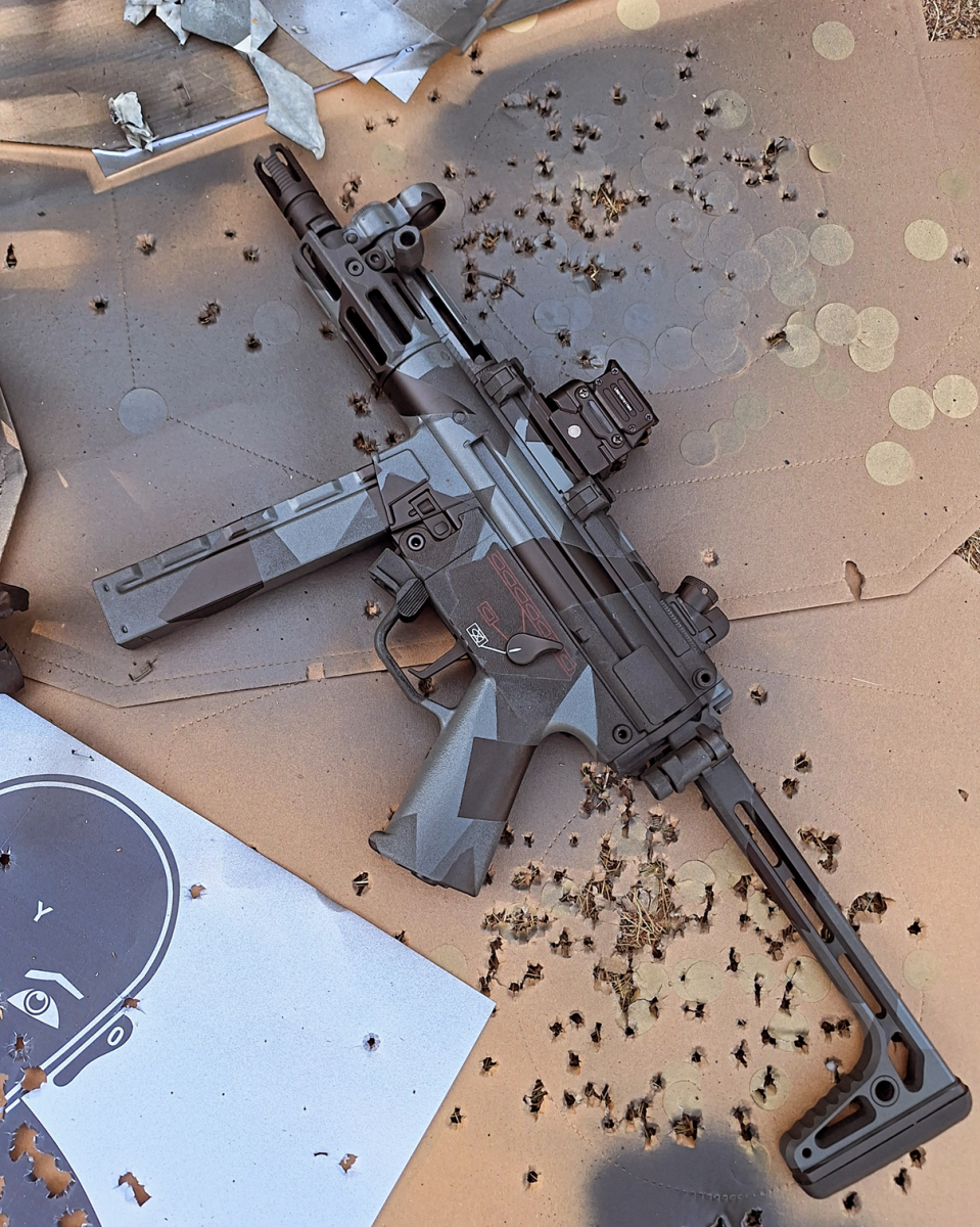 Cyma Platinum MP5K Upgraded 5db acélköpenyes 120bb-s midcap tárral. Tökéletes és hibátlan állapotban van, játékra kész. Egyetlen játékon járt, egyébként néha a lőtéren volt minimálisan használva. Kívülről kapott egy behajtható válltámaszt és egy "urban splinter" álcafestést.