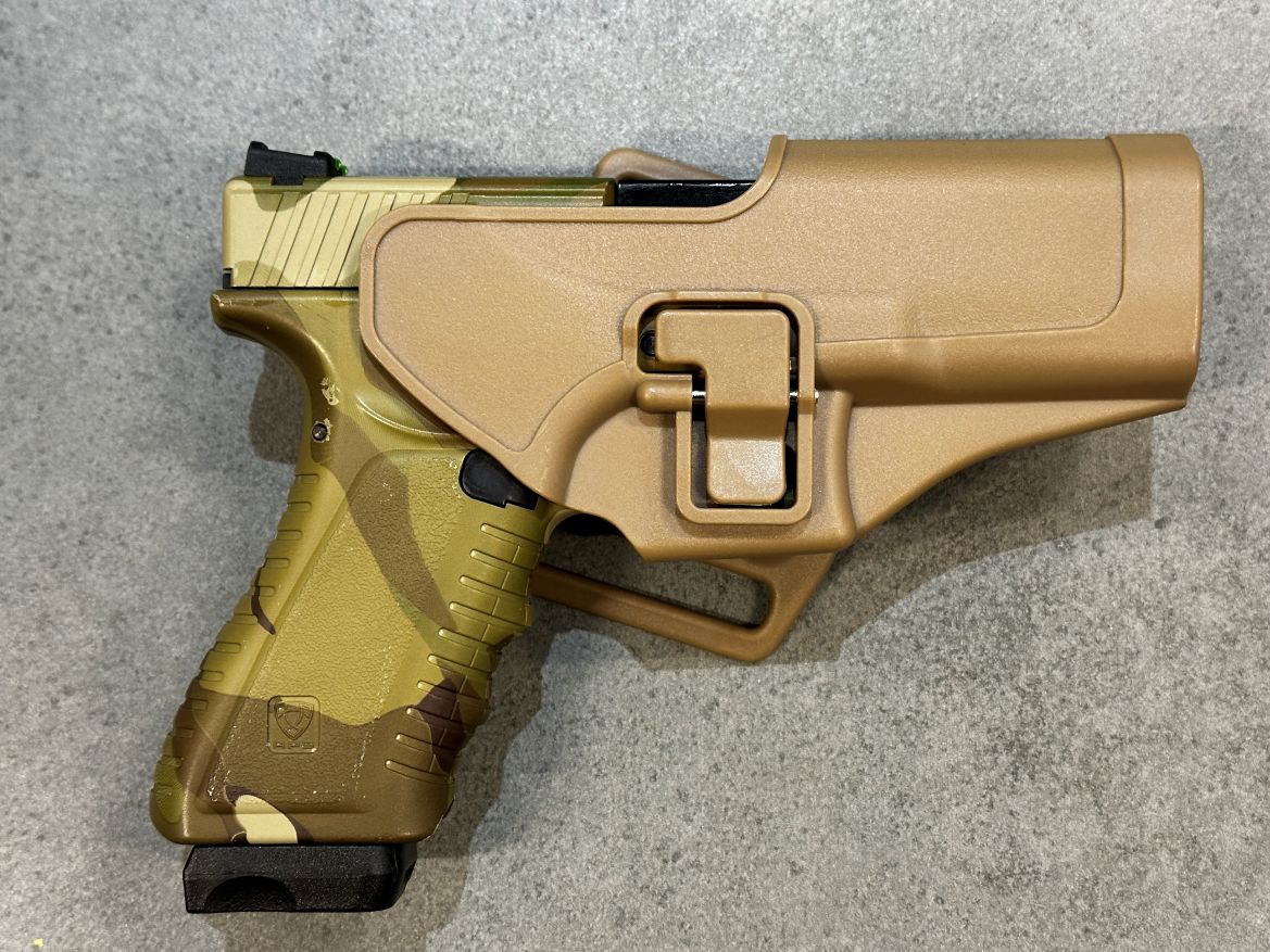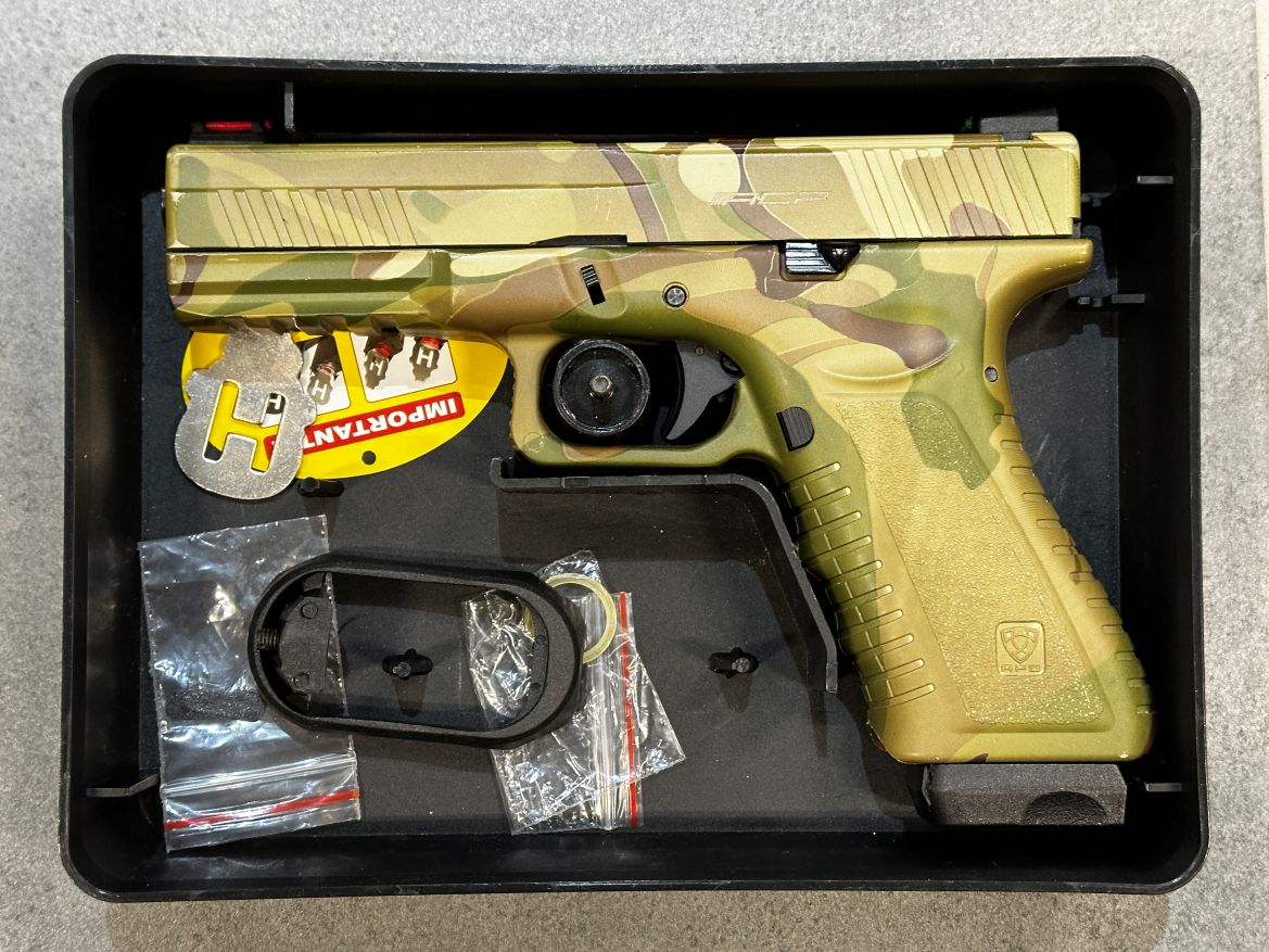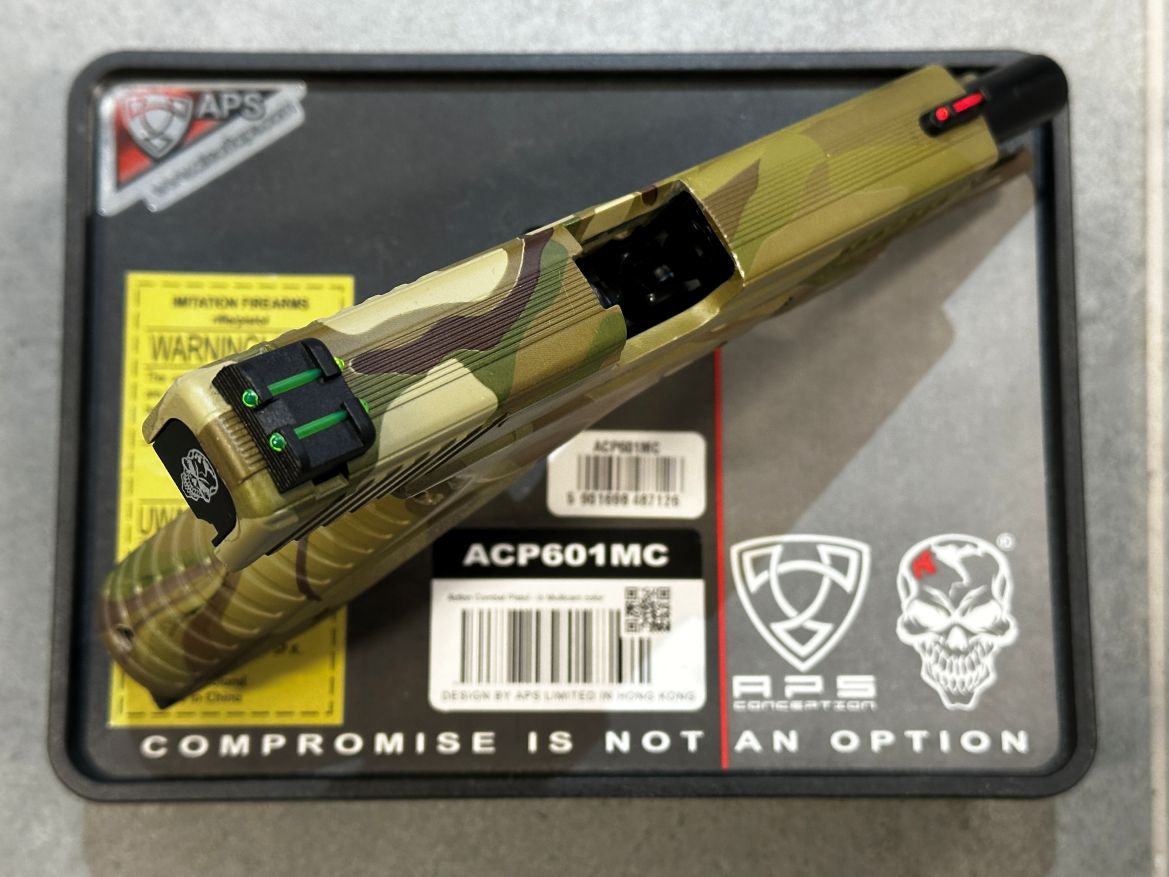 Eladó egy APS ACP601MC CO2 GBB pisztoly fém szánnal Multicam színben tan színű tokkal együtt. A replika játékon nem járt csak céllövészetre volt használva.