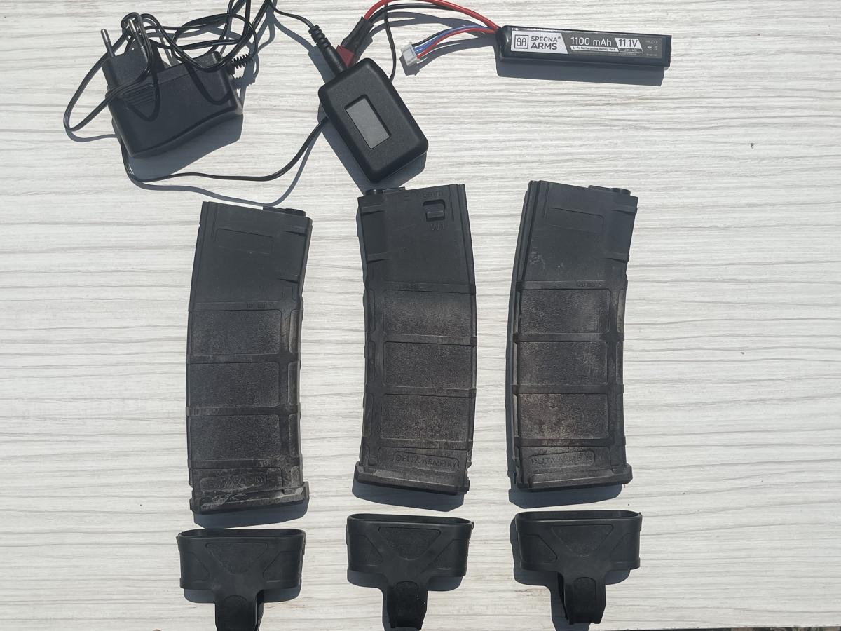 Egyedi festés, 4 db Delta Armory tár, tárkihúzóval, Specna Arms akksival, akksi töltővel és egy Pentagon tactical fegyverszíjjal.