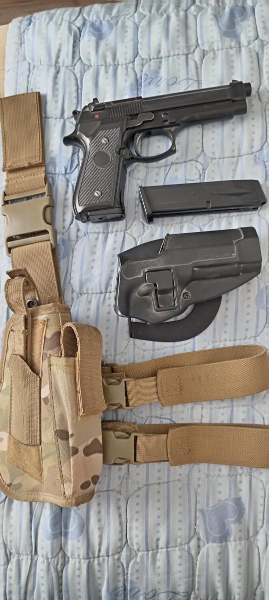 A combtok minimálisan kopott, de használható, a pisztoly hoz van beállítva de másmien pisztolyokhoz is jó, multicam terepszínben látható.