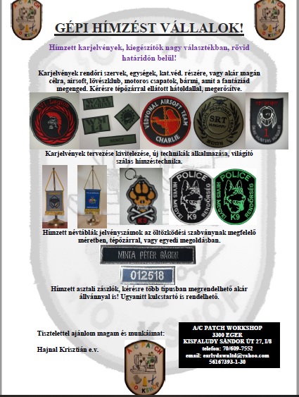 Egyedi karjelvények, névtáblák, egyéb kiegészítő felvarrók rendelhetőek. Természetesen posta megoldható. Hirdetés képei Hirdetés típusa Kínál Alkategória Egyéb kategória Megye Jász-Nagykun-Szolnok Hely Kunhegyes Átvételi lehetőségek MPL Postacsomag (házhoz szállítás) Ár 1800Ft Személyes üzenet küldése E-mail cím mutatása Feladó : Krisz45 Vissza a többi hirdetéshez a listázóba.