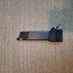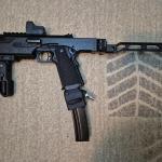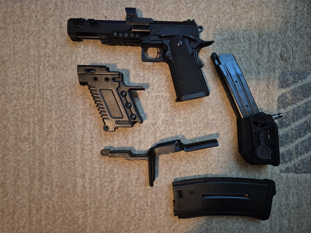 Egy saját tervezésű, és nyomtatású kit. (eSun ABS+ anyagból készült egy Bambulab P1S nyomtatón, nem fog eltörni, ha lejtik, ha meglövik). A Novritsch gyorstok adapter ami rajta van, hosszabb csavarokkal a pisztolyba van belerögzítve, így betonstabilan áll. A kitre került még egy 5KU „Curved Folding Skeleton Stock” és egy D-Day „Vertical Folding Grip”, így tudtam sniper mellé másodlagosnak is használni.