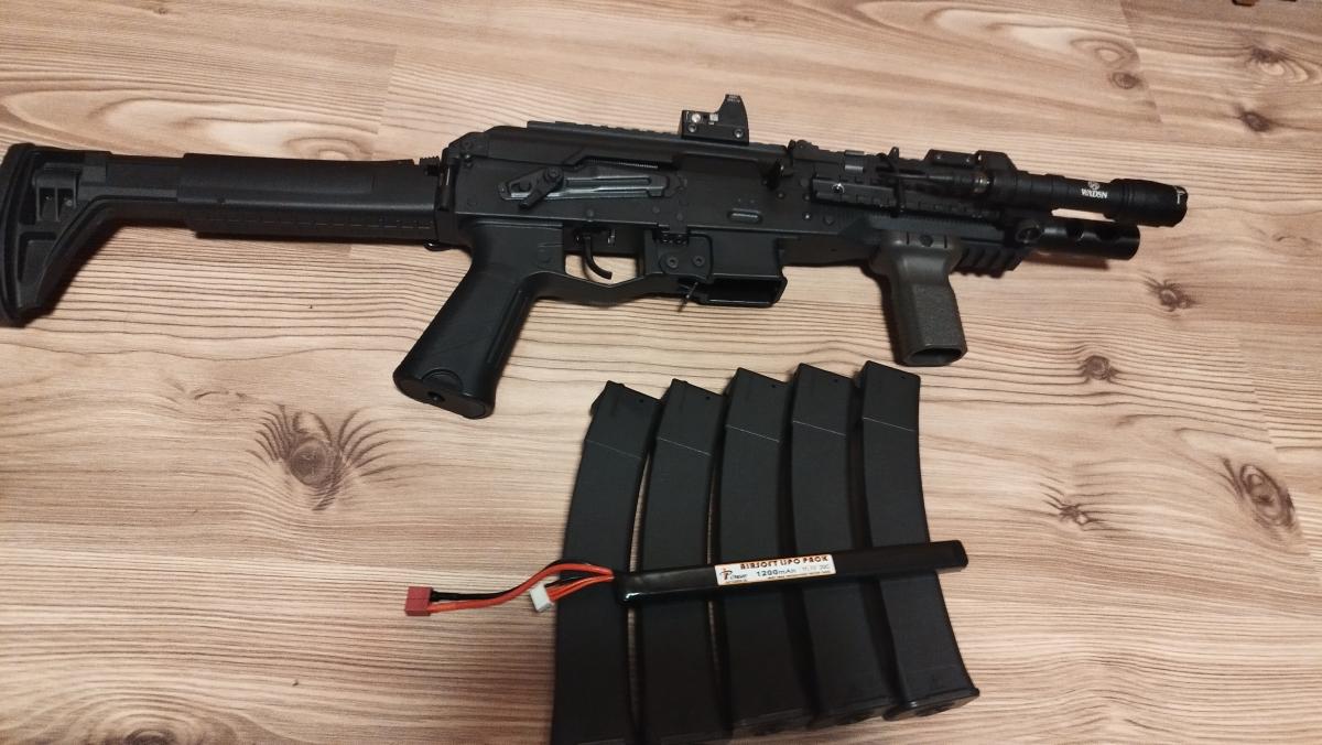 jár hozzá minden a képen ami ezt takarja: micro dot, wadsn taktikai lámpa, 5 mid cap tár, vertical grip, egy pontos sling.