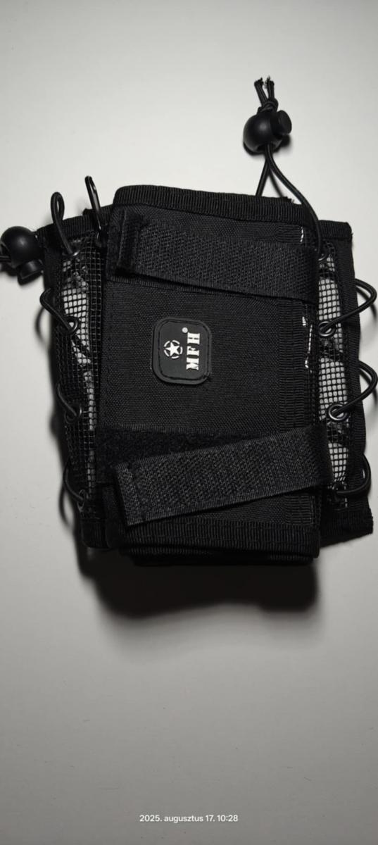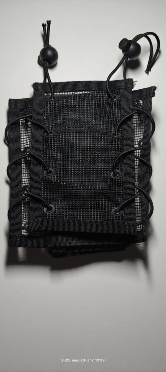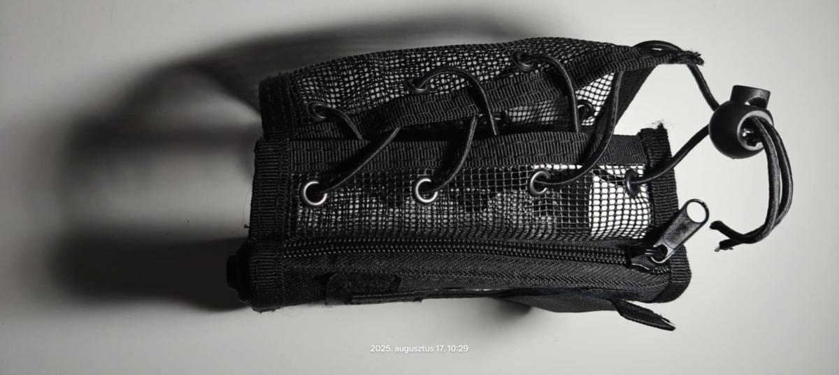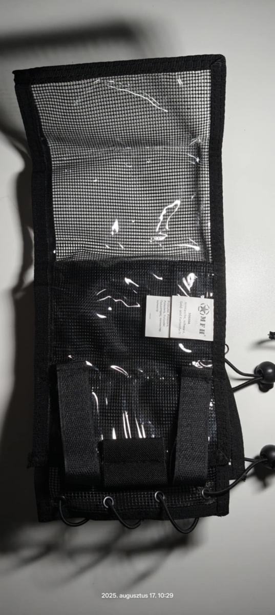 Légáteresztő hálós anyagból készült, szélessége 2 elasztikus zsinórral állítható 1 pénzzseb cipzárral 1 nagy, átlátszó térképzseb van rajta.