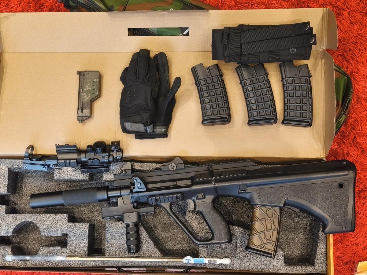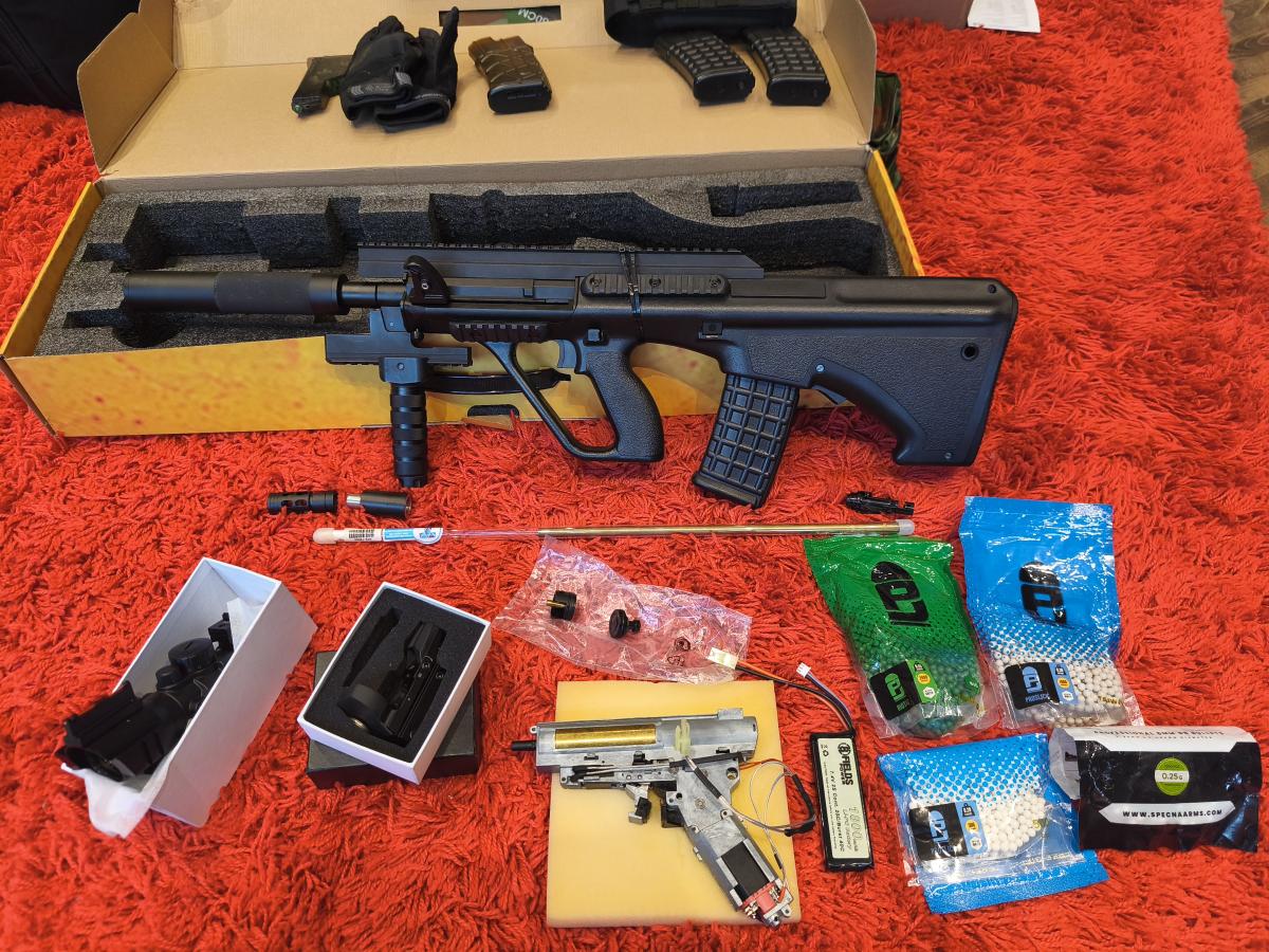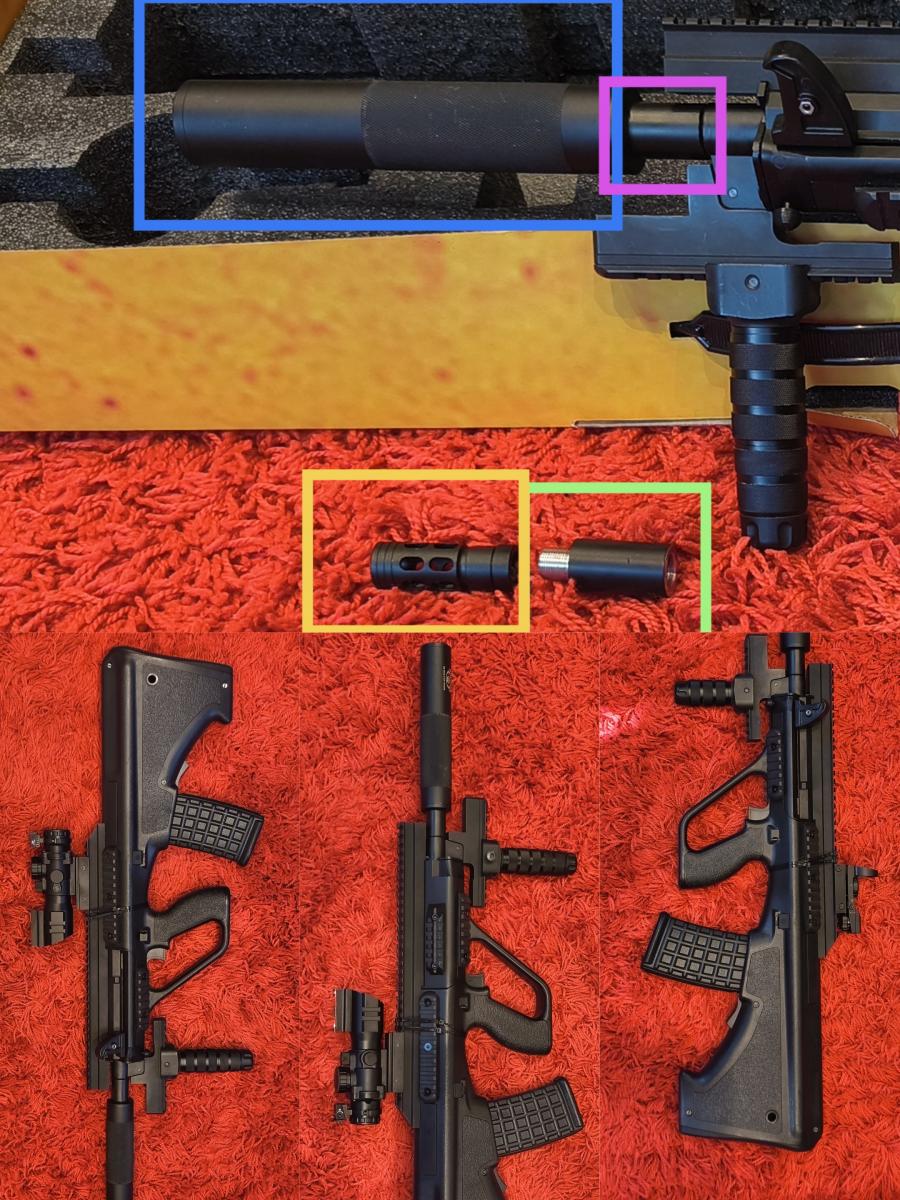 Vettem speciális hangtompítós dugattyút és nozzle-t. Az elv az hogy az utolsó 1cm-en "bent szorul" a levegő a tengerben így nem a nozzle hátán csattan a dugattyú, hanem csendben kifujja a maradék levegőt. El tudod képzelni ;) Aki ismeri az AUG -okat tudja hogy jól zárható a fegyv. ház tehát tovább lehet hangszigetelni, nem csak komfortos CQB, Assault de csendes DMR is lehet belőle
