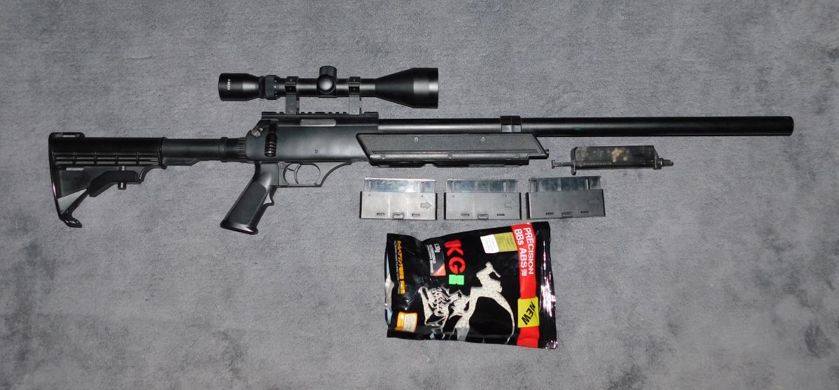 Tartozik hozzá 3 tár, 1 gyorstöltő, egy kis 0.30g-os BB, valamint egy 3-9x50-es optika.