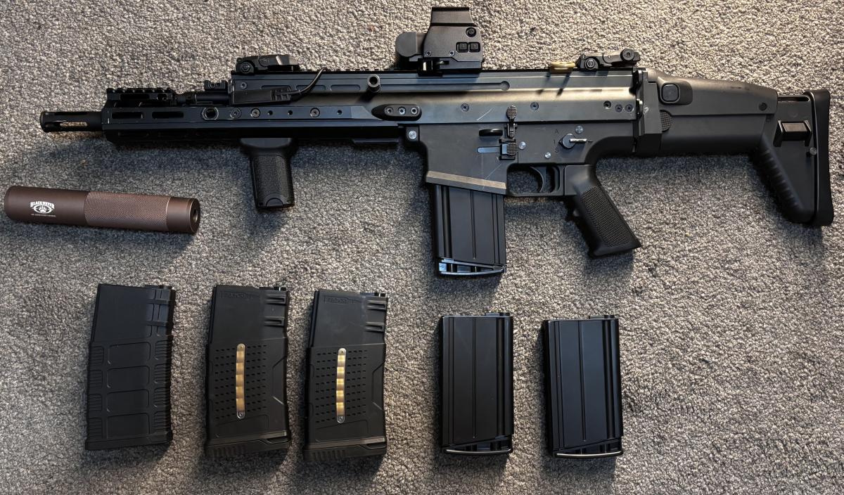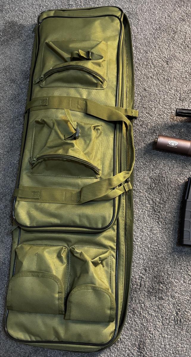 Jár hozzá egy EOTech holosight, hangtompító, elülső markolat, 6db mid cap tár, fegyverlámpa és egy hordtáska.