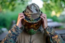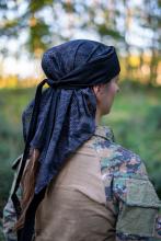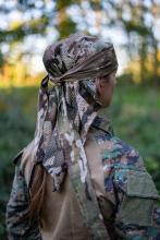 - A teljes fejet fedő terepmintás hálózat fokozott álcázást biztosít, megtörve a fej kontúrját.