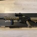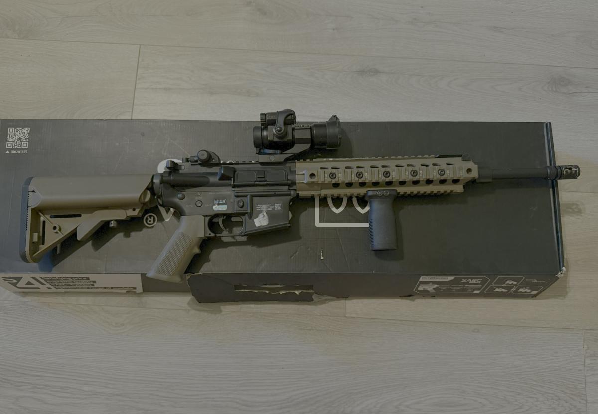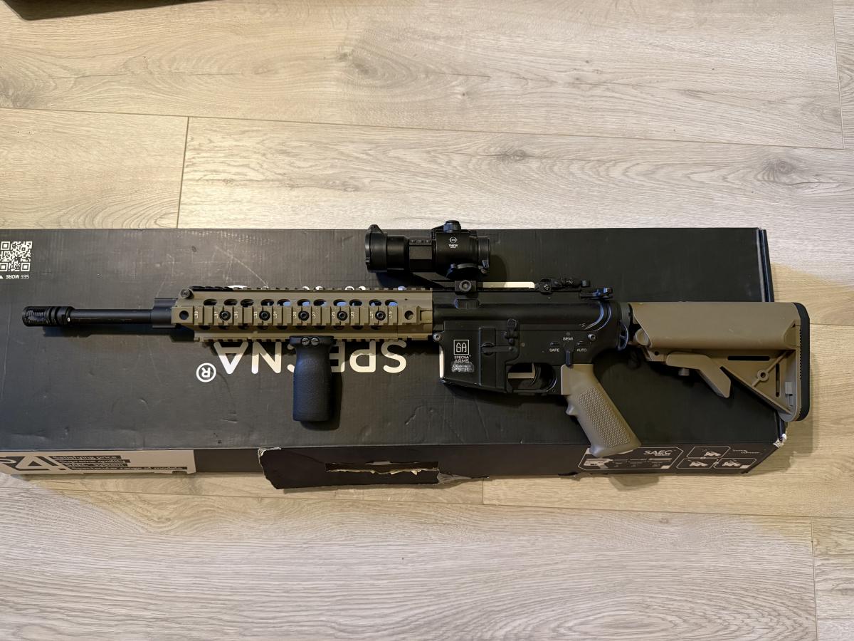 Eladó a Specna Arms B03 típusú airsoft m4 replikám! Teljesen működőképes és szépen teszi a dolgát, ami az árban benne van az 1 darab Electro river 7.4V 1200mAh LiPo aksi, 4 darab szinte új tár, a rajta lévő irányzék ami egy Theta Aimpont M2 black és a grip.