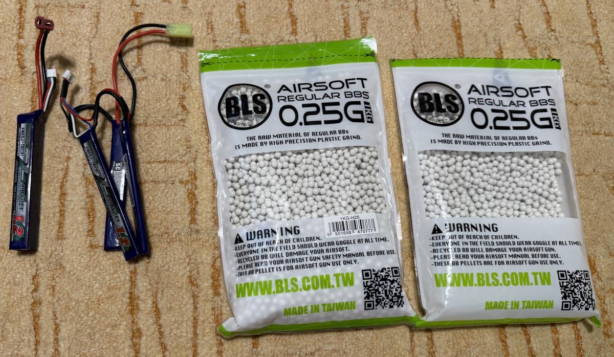 2db akku, kb 1.5kg BLS 0.25g-os BB, gyorstöltők illetve BB tartó
