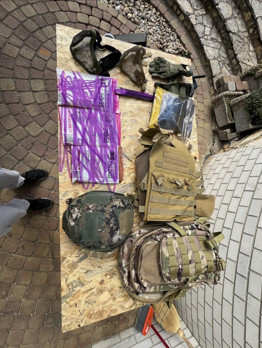 Mindegy gyerek méretben:2 rácsos maszk, egy pár kesztyű védővel benne, mellény,táska , sisak és hozzá járó tartozékok.(A képen látható bb, es rugó nem jár hozzá)