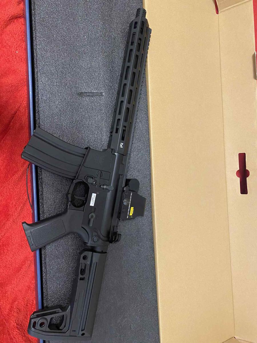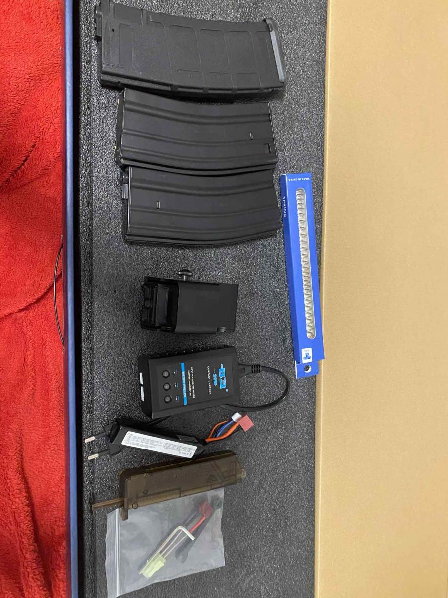Eladóvá vált egy Double Eagle M906D airsoft gépkarabély kitűnő állapotban, eredeti dobozában. A fegyver keveset használt, karbantartott, hibátlanul működik. Tökéletes választás kezdőknek és haladóknak is -- kiváló ár-érték arány, modern kialakítás, elektronikus elsütő egységgel (Etu) és programozható tűzvezérléssel. Főbb adatok: o Gyártó: Double Eagle o Típus: M906D (AR-15 stílusú AEG) o Anyag: Nylon szálas polimer test, fém belső alkatrészek o Hop-Up: állítható o Lövedéksebesség: kb. 370-400 FPS (0,20g BB-vel) o Tűzmódok: Safe / Semi / Full Auto (programozható) o Tápellátás: Lipo akku (T-Deans csatlakozó) Tartozékok: o 3 db tár o Akkumulátor és töltő o Red dot irányzék o Pót rugó (dobozban) o Tisztító pálca, kiegészítők Minden az eredeti dobozában, gondosan csomagolva.