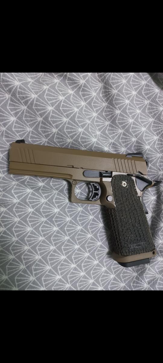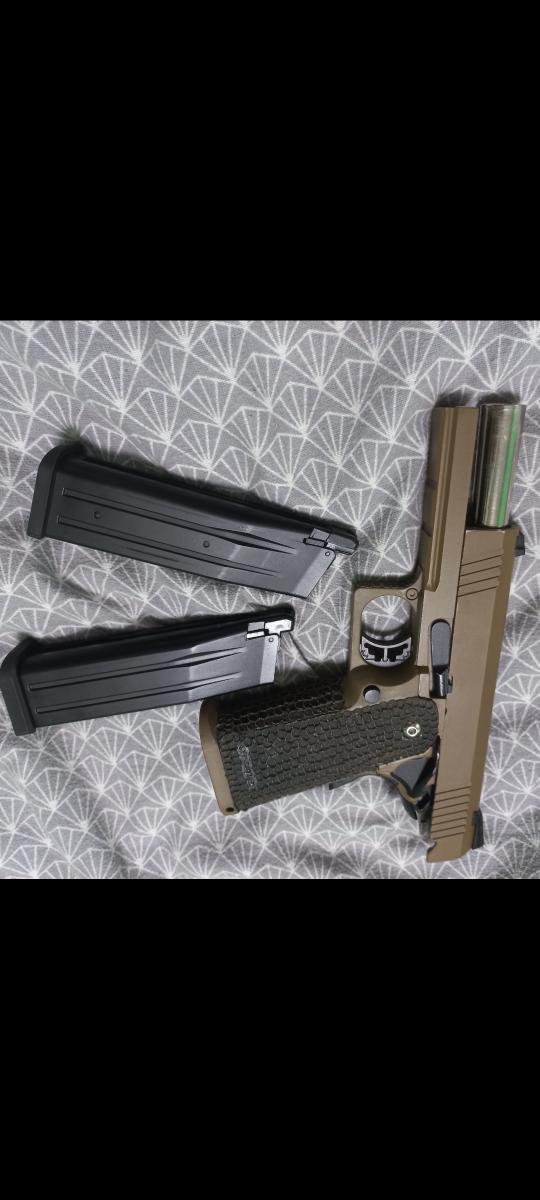 Eladó G.E. 3303 . gbb green gas pisztoly, tartalék tárral ,bb- vel ,green gas-al ,bb adagolóval. A pisztoly markolata érdesítve lett . Újszerű, hibátlan állapotban van! Jár még hozzá egy Helikon-tex tépőzáras taktikai pisztoly tok!