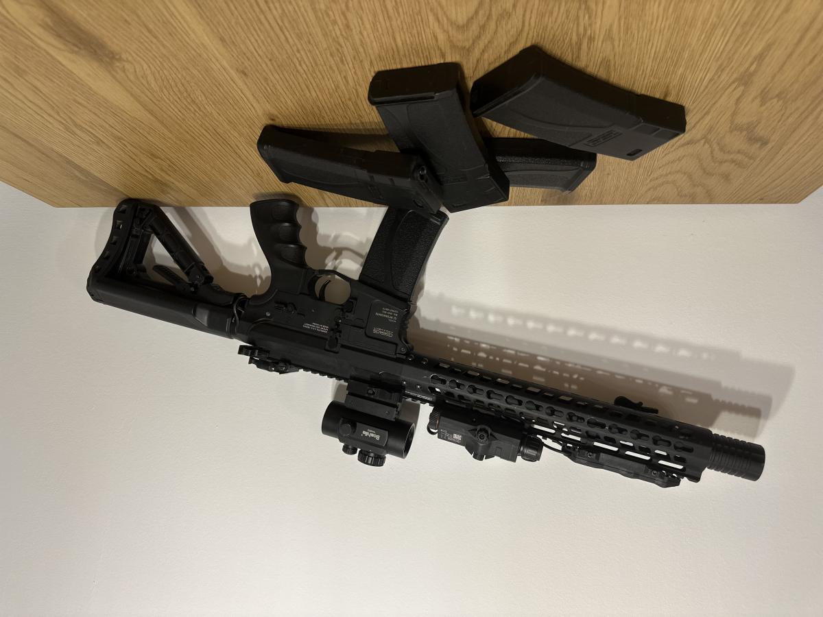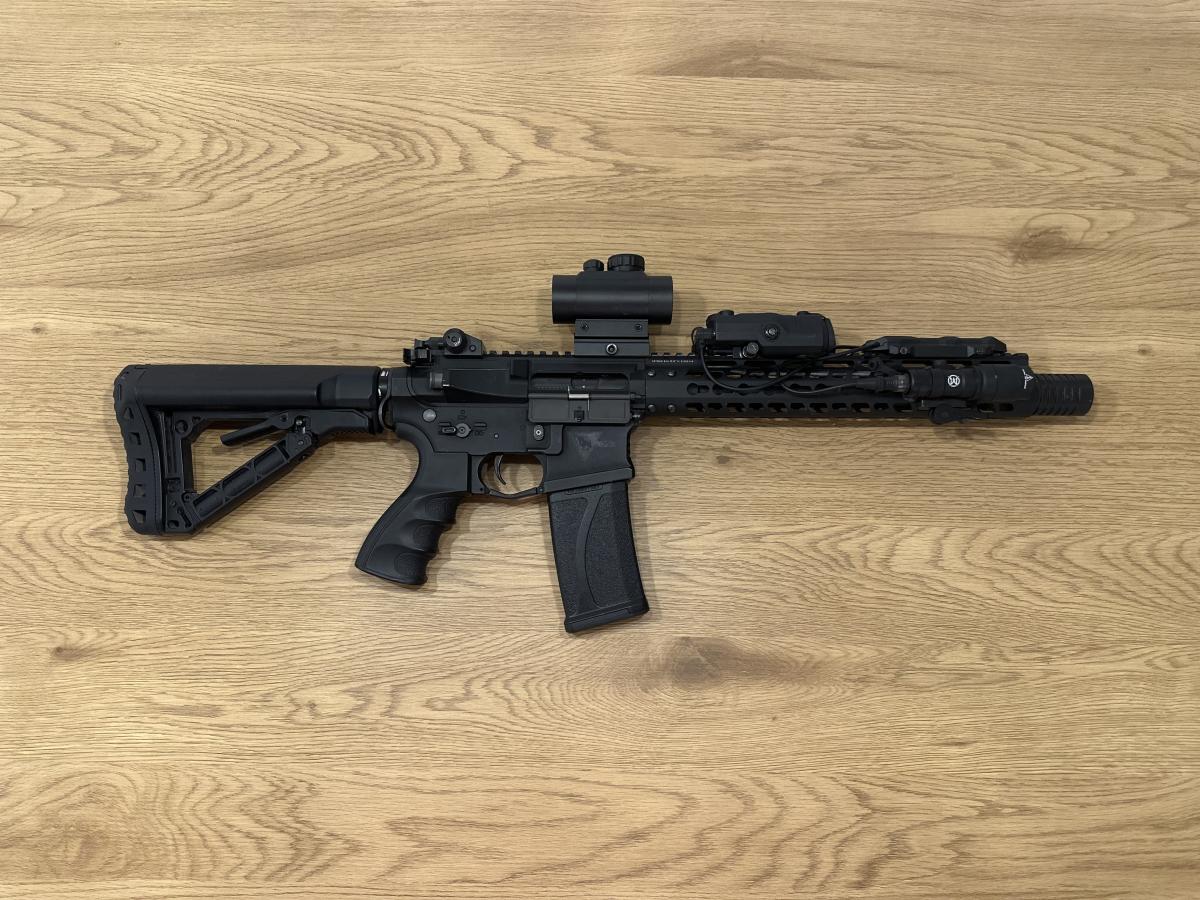 Eladó G&G Wild Hog 12” 5 db tárral irányzékkal peq val lámpával. T-csatlakozöval szerelve. Ezen kívül módosított a belseje is Rugóvezető, rugó, dugattyú, dugattyúfej, hengerfej, nózi, (max) kamra, 6.02-es preccső került bele.
