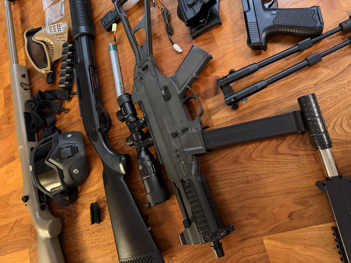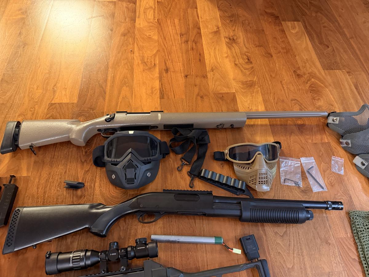 Airsoft felszerelés csomag — puska, sörétes, sniper, pisztolyok, maszkok, kiegészítők