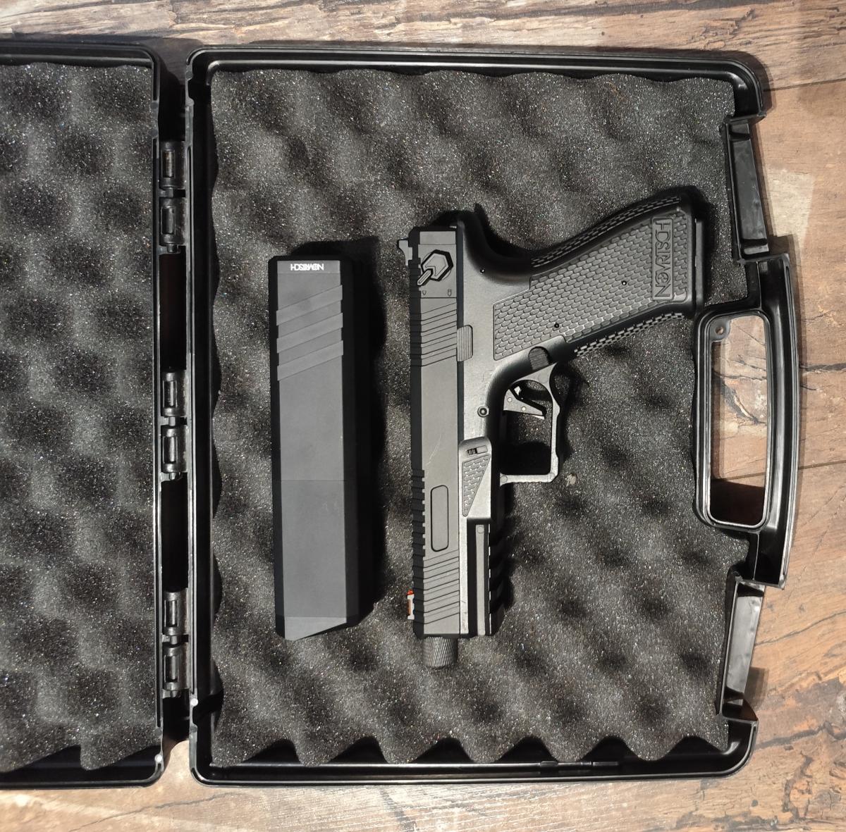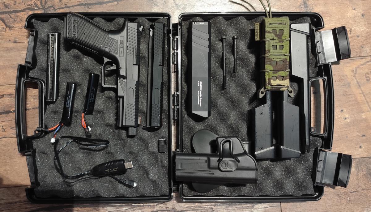 (ÚJ ÁRAK: Pisztoly 119 €, akksi 9.90 €, töltő 4 €, 100-as tás 3db 39 €, gyors tok 15 €, „bőrönd” 19 €, tár tartó + osztó 21.90 €, szögletes hangrompító: 39 € Össz.: 266,8€ 380 euróval: 101 500Ft)