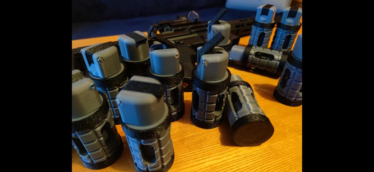 ABS műanyagból 3D nyomtatott airsoft gránát ami rózsapatronnal működik. Akár többször használható, gumi peremmel van ellátva ami védi az ütődéstől eldobáskor.