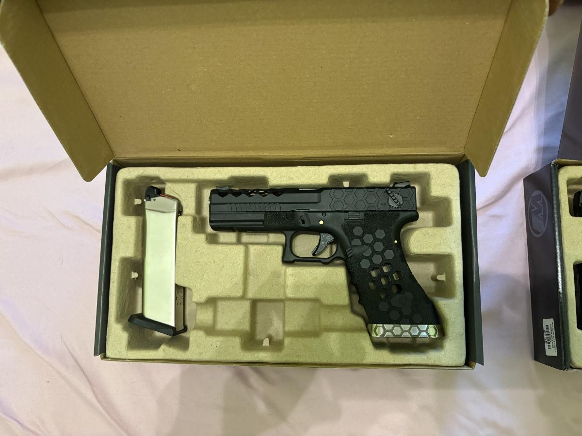 Sziasztok eladó teljesen új Airsoft green gáz glock pisztolyok.az alap 18c. Kb 3 alkalommal volt használva az Aw custom átlátszó vázas pedig csak kipróbálva volt.Nagyon jó mind a kettő de kinéztem valamit amit szeretnèk megvenni ezért adom el.Teljesen automata mind a kettő.Az AWcustom 38000ft A WE 35000ft.