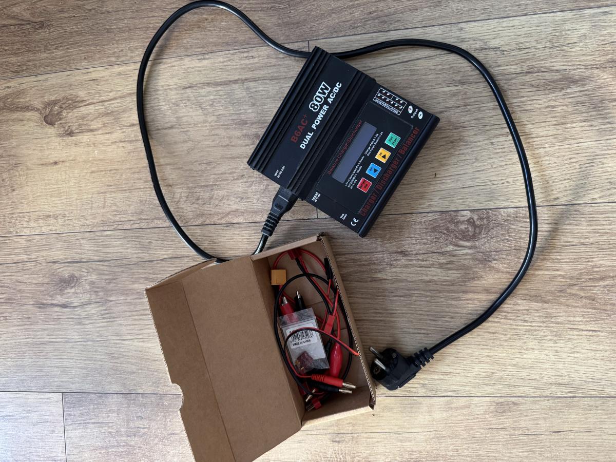 Balanceres, minden tartozekaval, tobb fajta akkumulator csatlakozo kabel van hozza.