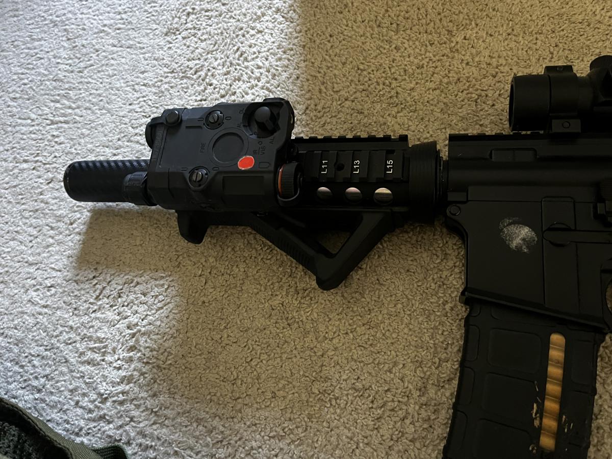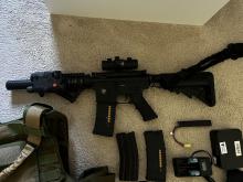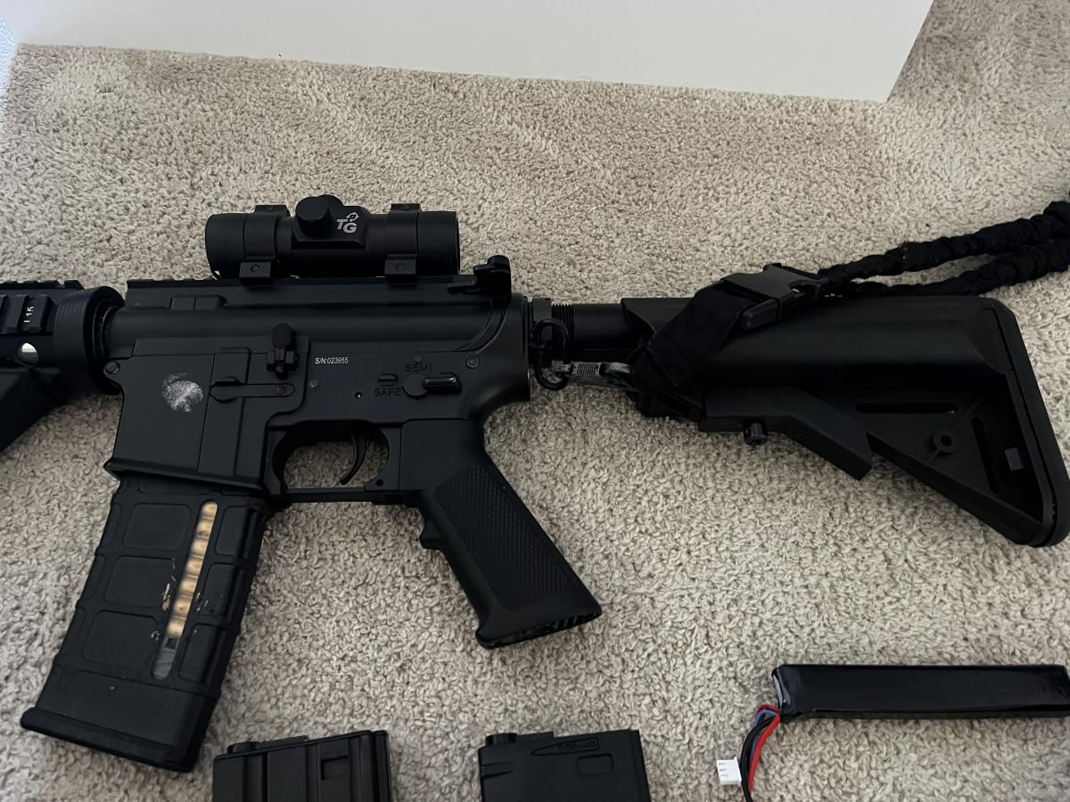 Eladóvá vált a képeken is látható CYMA M4 fém gépkarabélyom. Amit tudni kell róla, hogy keveset használtam, kisebb esztétikai átalakításon esett át. A cső lett rövidítve továbbá kapott rá egy 3D nyomtatott hangtompítót, így egyaránt alkalmas CQB-re és normál használatra is. Tavaly évben lett rendbe rakva beolajozva stb. azóta nem volt használva, így egy karbantartás ráfér. A fegyveren továbbá található egy irányzék mely 2 színben állítható, fényereje változtatható. Kapott még egy első markolatot és egy PEQ dobozt mely lézerirányzékként és fegyverlámpaként is funkciónál. A karabély a fent említett tartozékokkal 1 db tárral és aksival 65.000 Forint