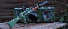Az ötlet pár hónapja ugrott ki a fejemből ,megálmodtam megépítettem mindent amit szerettem volna beszereztem hozzá .A táska és a puska No, megállj csak! Ruszki rajzfilm ihlette, kb 80 -90 évekbe fejezve Kzs camouflage dekorral. Minden lelett homok szórva alapozva és felépítve minden réteg. A táskén a csattok lecserélve rugós béka zárakra (lakatolható ) szivacs a belsöjében .A puska nagyobb falat volt sok apró hibája volt de mind orvosolva lett csere vagy újra építés útján. A stukker kapott új 6.03 rozsdamentescsövet egy elemet kamrát egy medbul gumit .A gb felújítva fémfaogas rövid löketű dugóval, egy alu nózival, és egy dugófejjel. Ha jól emlékszem 13,1 fogaskerekekkel illetve egy nagy nyomatékú motorral lett felszerelve .Van benne egy fet igy bátran lehet 11 v kasival hajtani. Igy a cuc gyors és pontos lett 60 m simán viszi pontosan. Ami jár a szetthez egy táska egy dobtár (aksis ) és maga puska tompítóval .Cserét talán ,beszámítás van posta szintén ha kérdésed van irj vagy telefonálj .Minden kérdésre válaszolok .