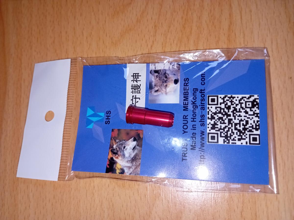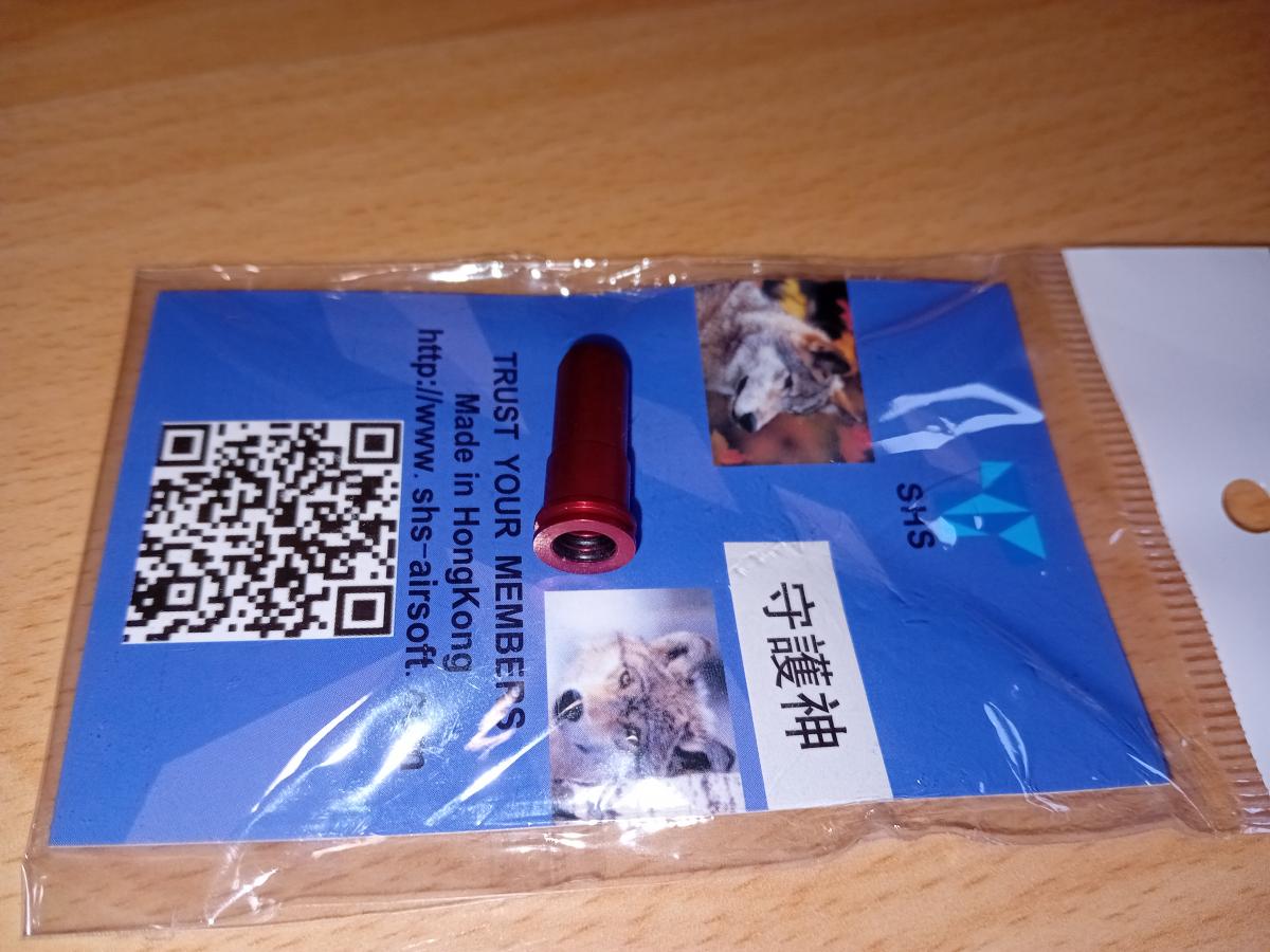 Eladó a képeken látható M4 airsoft AEG replikába való SHS alumínium nozzle, 21,41mm hosszú, gumi O-gyűrűvel.