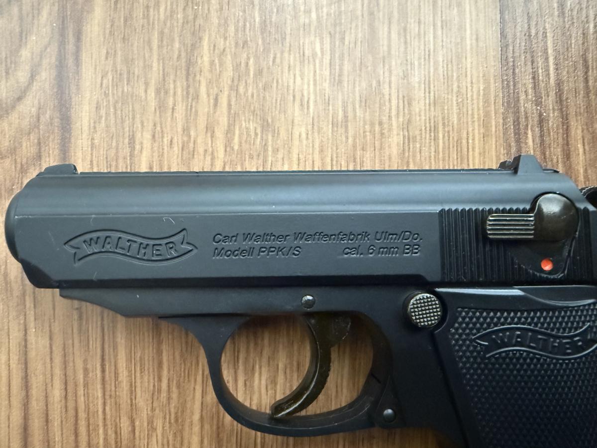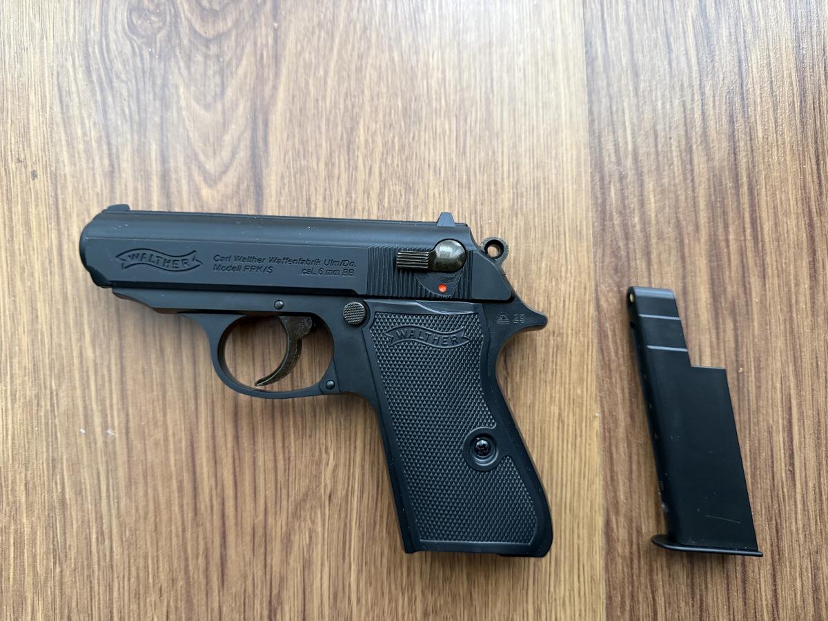 Walther PPK/S rugós airsoft pisztoly fém szánnal, 6mmBB – Az eredeti modell hiteles másolata. Akár dísznek, akár airsoft játékra ideális kiegészítő fegyver. A rugós szerkezet működése egyszerű és megbízható, minden lövés után hátra kell húzni a szánt a csőre töltéshez. Fix irányzékkal és fém szánnal látták el, a belső alkatrészek is fémből készülnek.