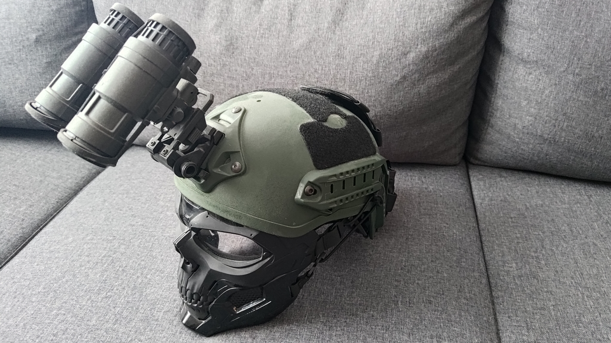 Eladó a képen látható sisak, maszkkal, NVG pouch-al és (PVS31) NVG Dummy-val.