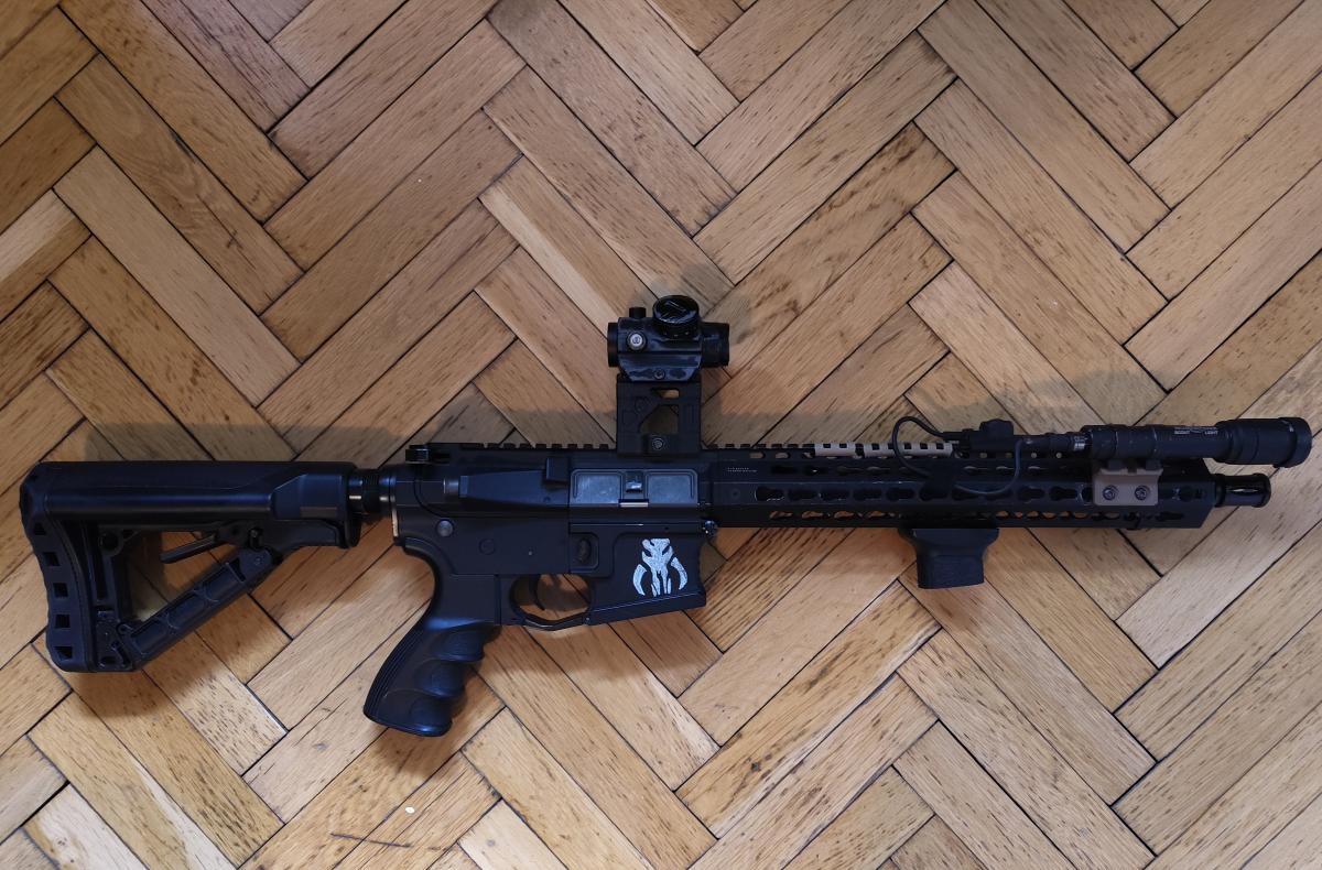 A képen látható verzióban: 3d nyomtatott unity + t1, surefire replika. Igény esetén az optika cserélhető egy Vortex UH1 kopira (+15e).