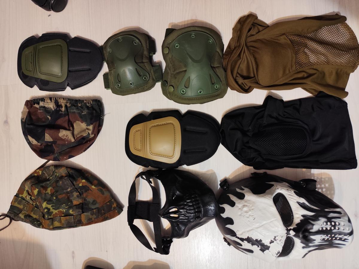 Eladóak a képen látható maszkok, térdvédők, sapkák, övek